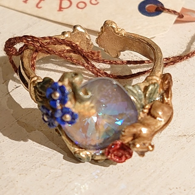 素材 真鍮に塗装、キラキラガラスストーン サイズ フリー シマリスがモチーフのかわいらしいリングです。 周りを囲むモチーフには、リスやお花のデザインが施されています。 手元を華やかに彩り、気分も上げること間違いなしです! さらに、フリーサイズなので、サイズの心配もありません。日常使いはもちろん、パーティーやイベントにもぴったりです。 このリングは、パルナートポックと言うブランドで人気の渋谷の工房が手がけた作品です。 彼らは日常や自然や動物などなどからインスピレーションを受けて、繊細なデザインを生み出しています。 その一つ一つには想いやストーリーが込められています。 身につけることで、デザイナーさんたちの思いを共に楽しむことができますね! ぜひ、この素敵な東京発のリングを身につけて、特別な日々を過ごしてください。 ※ガラス製品は取り扱いに注意が必要です。衝撃や摩擦により壊れる可能性がありますのでご注意ください。