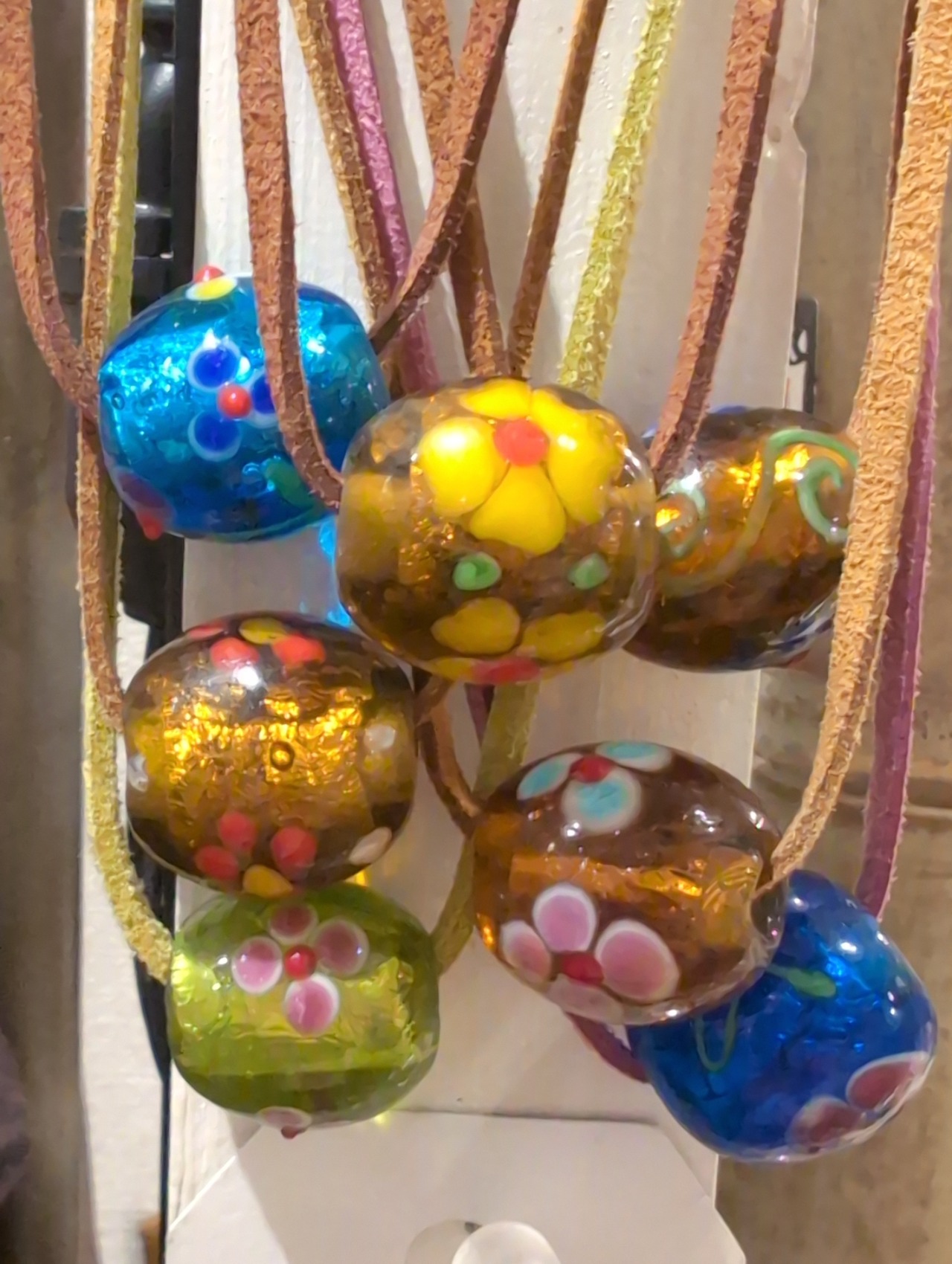 このネックレスは、20年ほど前に手作りで作られたトンボ玉を使用しており、革紐との絶妙な組み合わせが特徴です。