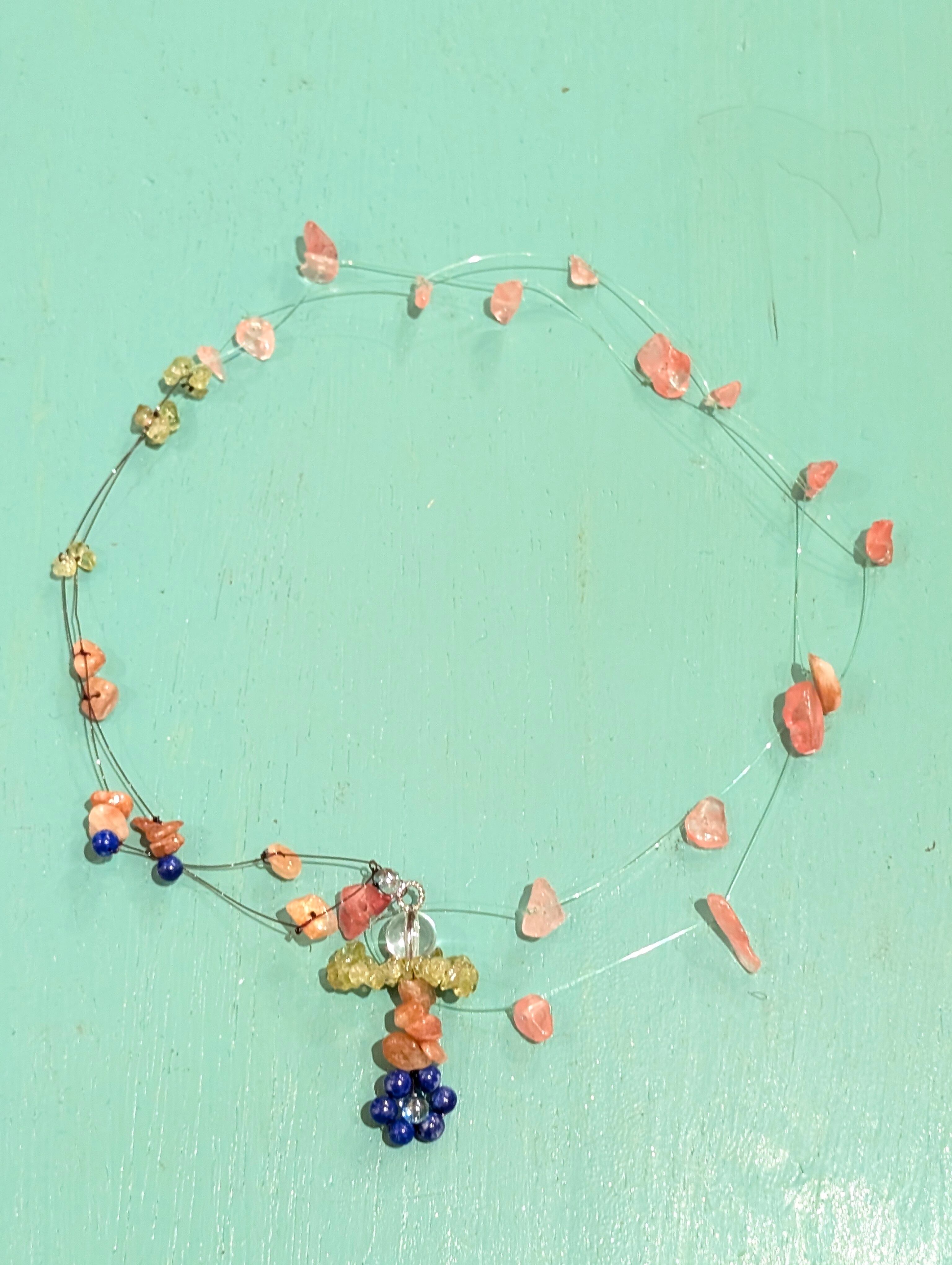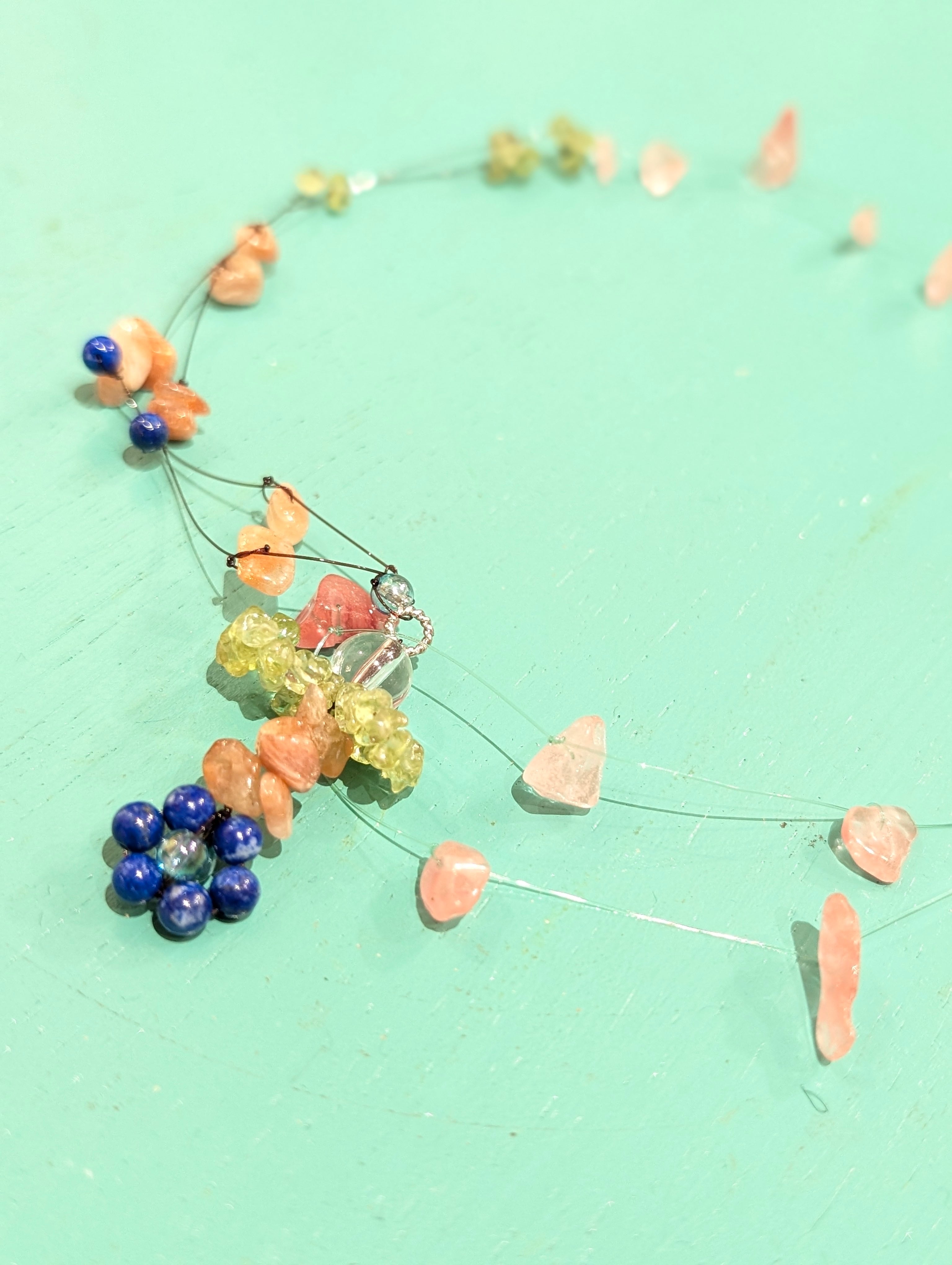 こちらのお花のかぶれにくいペンダントは、ペリドット、サンストーン、ソーダライトといった天然石を使用し、カラーテグスで華やかにデザインされたハンドメイドのアクセサリーです。