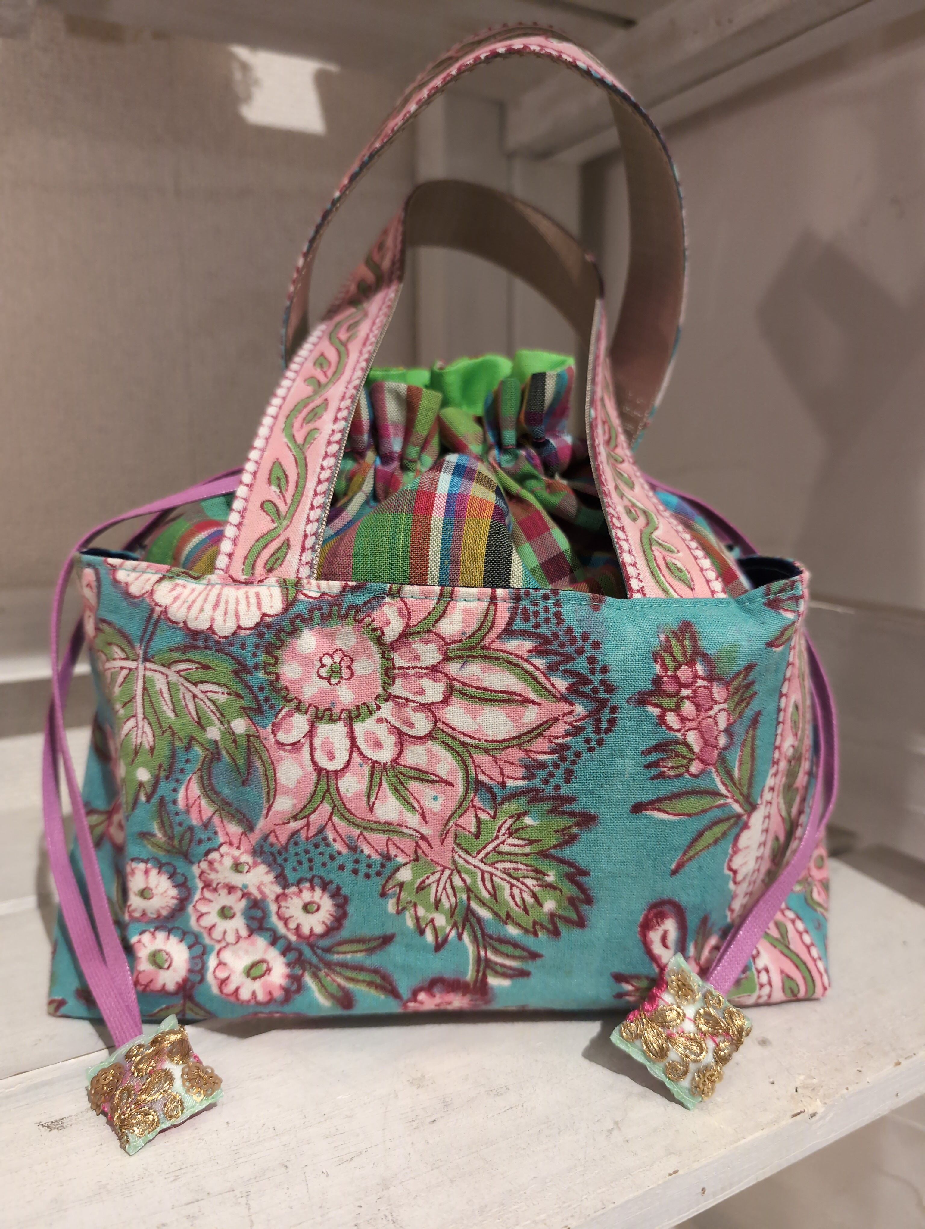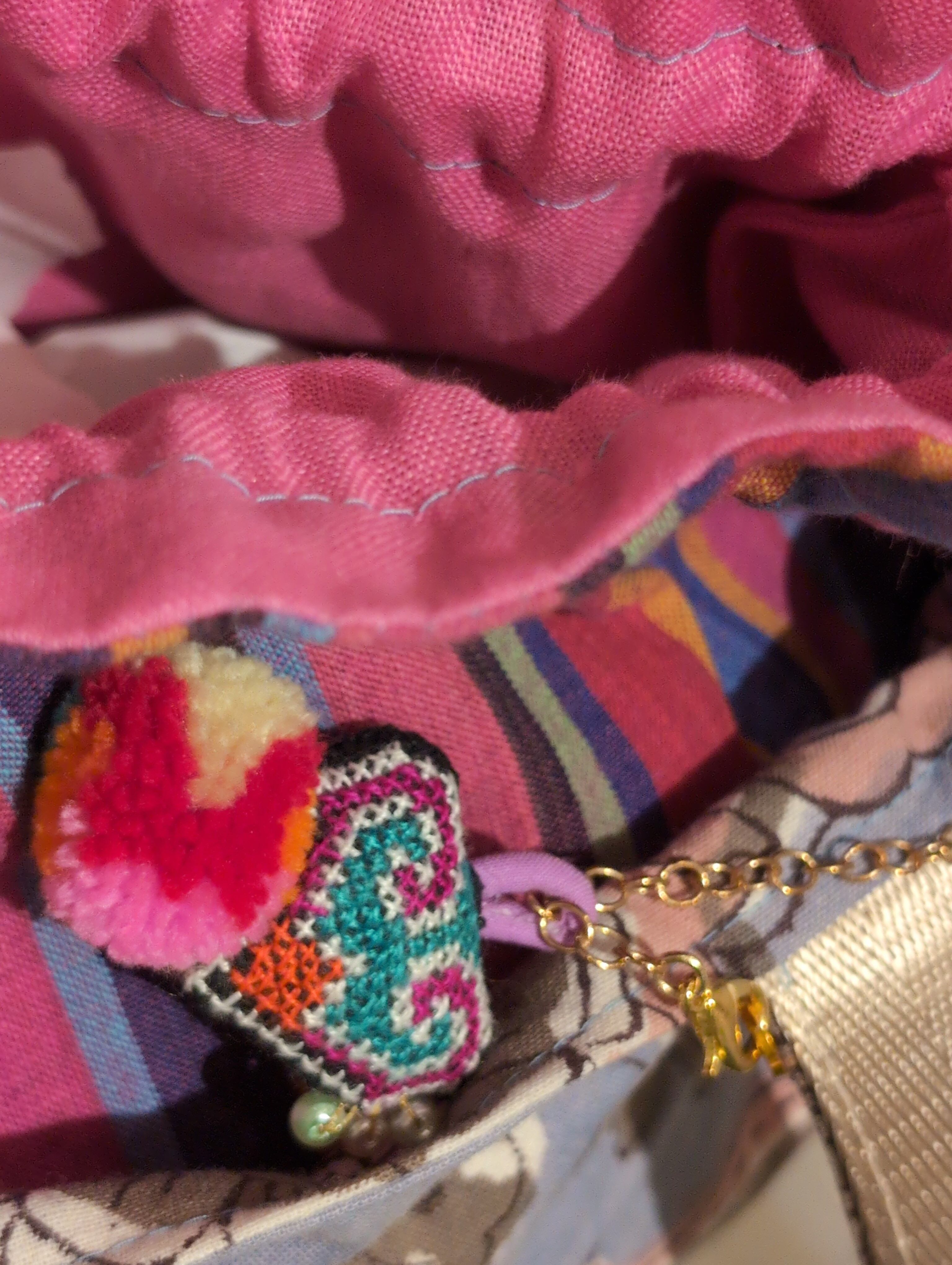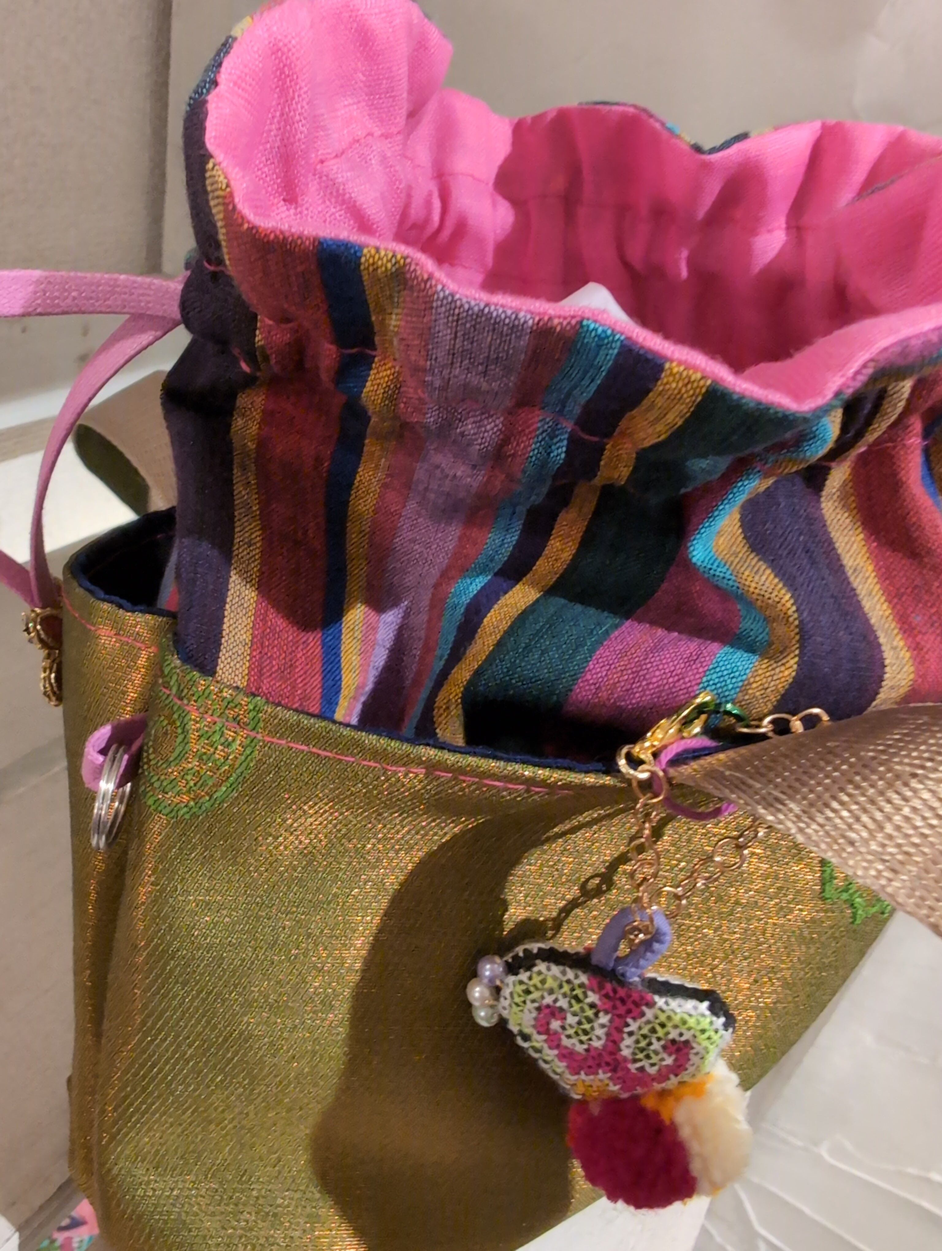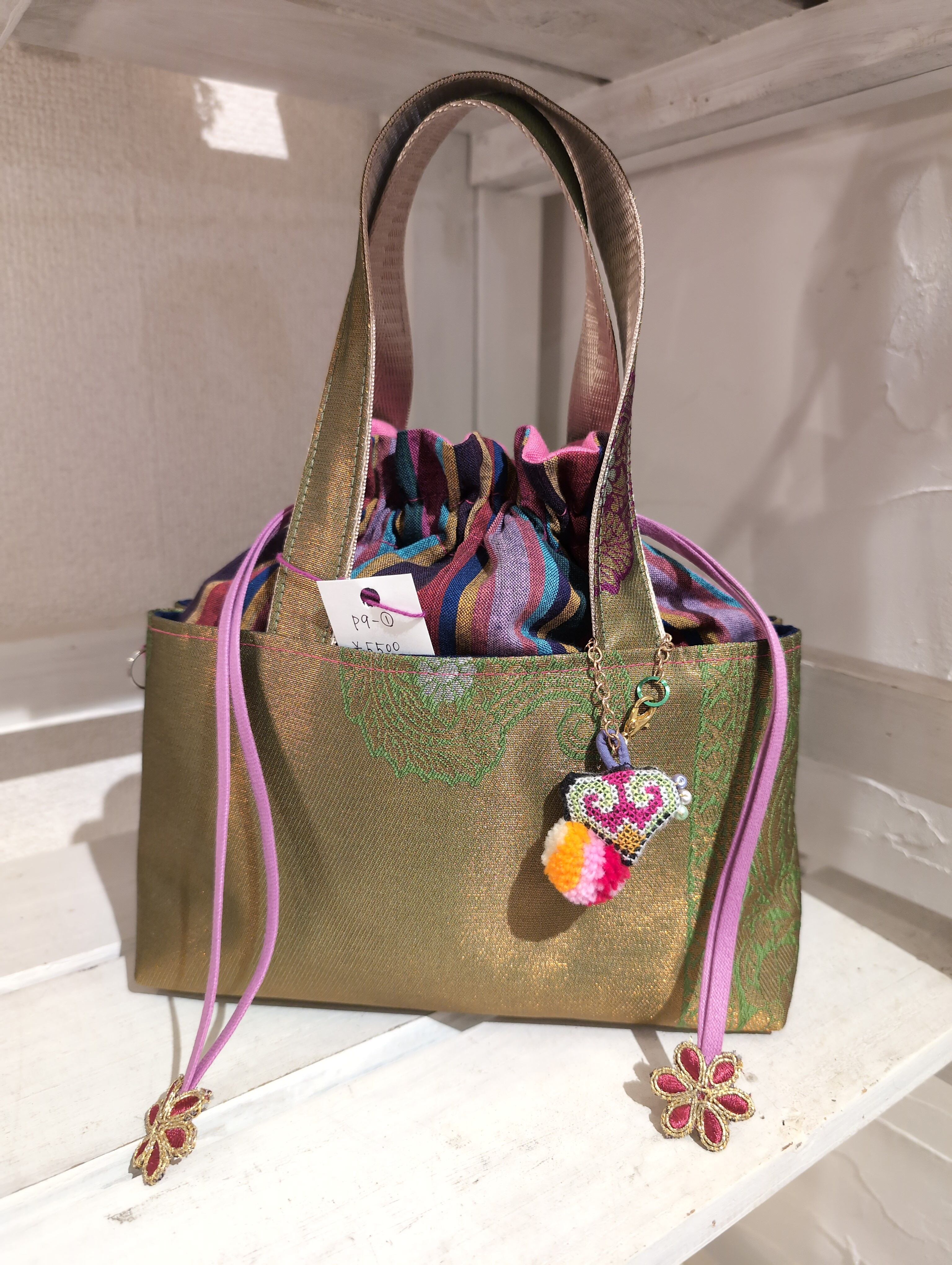 巾着縫込みバッグ 〜 タイやマレーシア、インドなどの生地使用 カラフル キラキラ 刺繍 か激かわの技 timo,coさん ハンドメイド作品