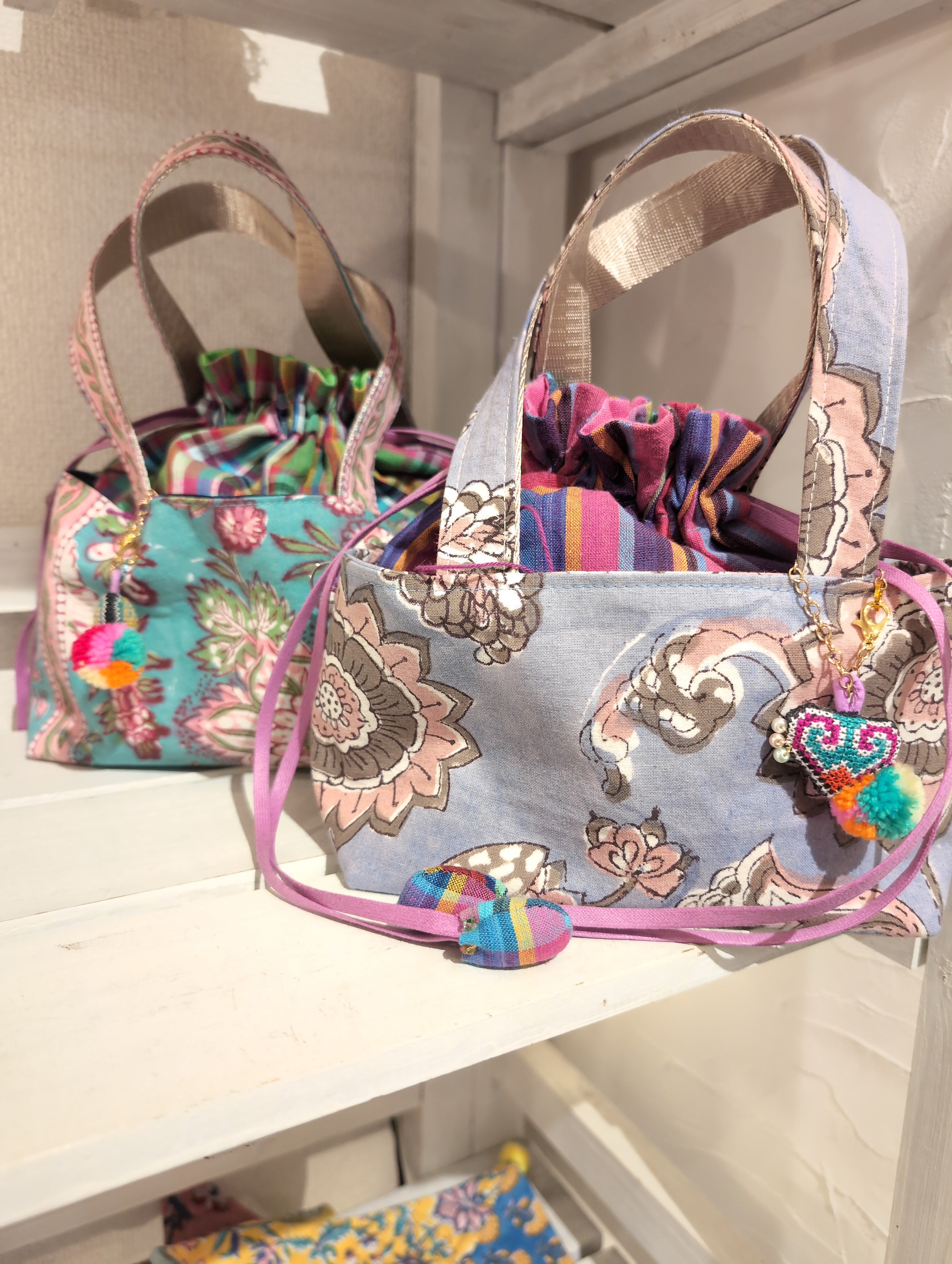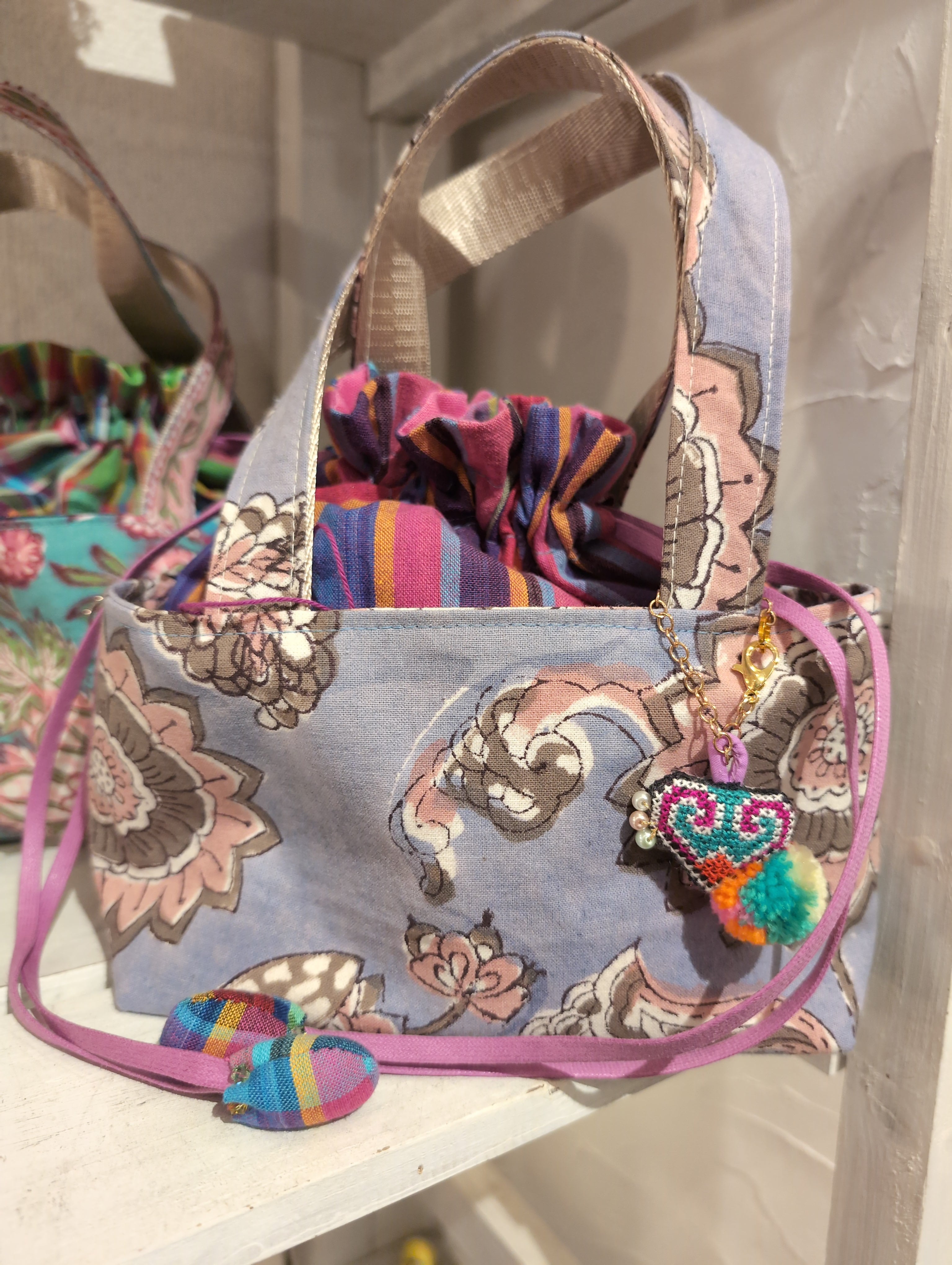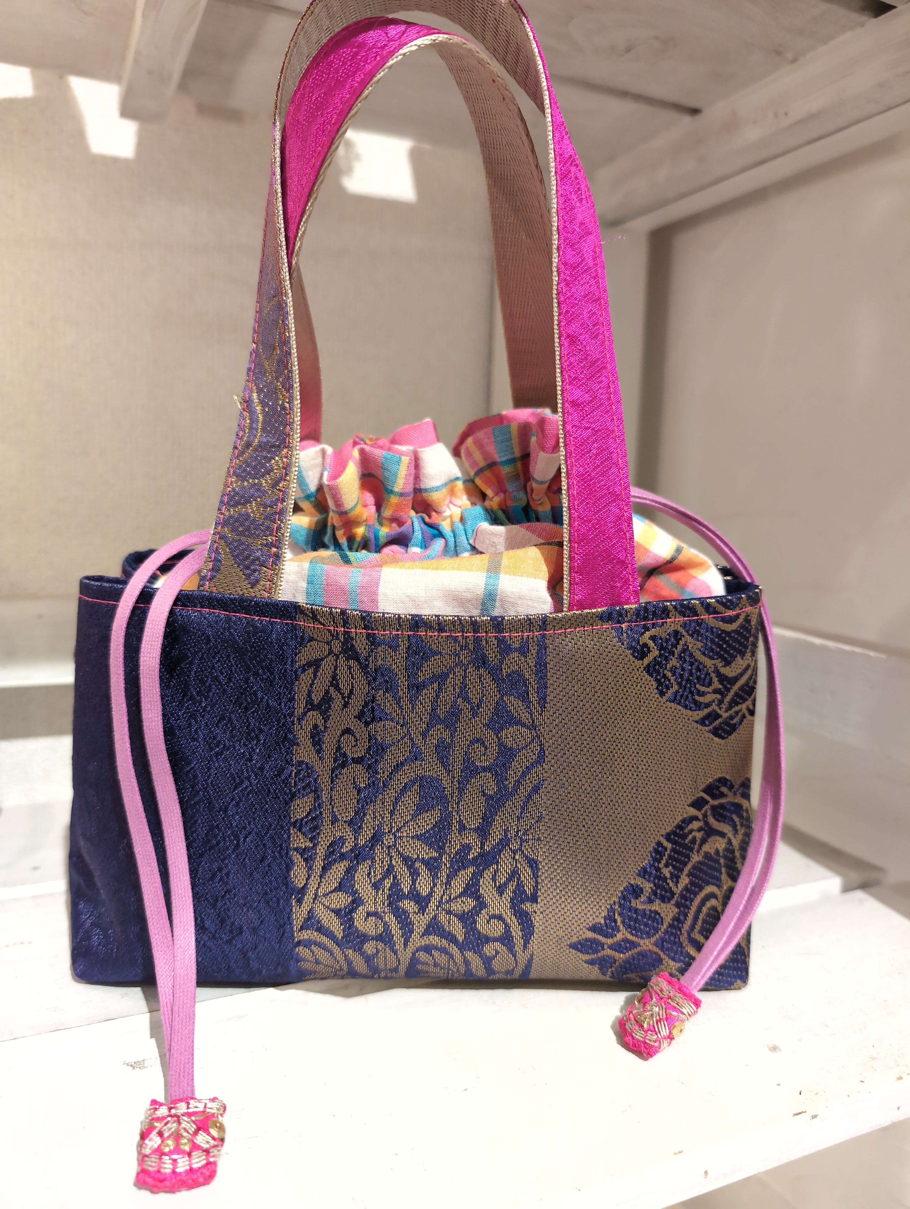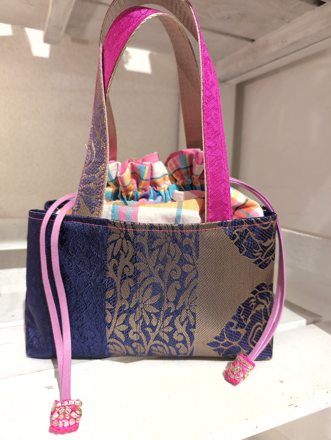 巾着縫込みバッグ 〜 タイやマレーシア、インドなどの生地使用 カラフル キラキラ 刺繍 か激かわの技 timo,coさん ハンドメイド作品