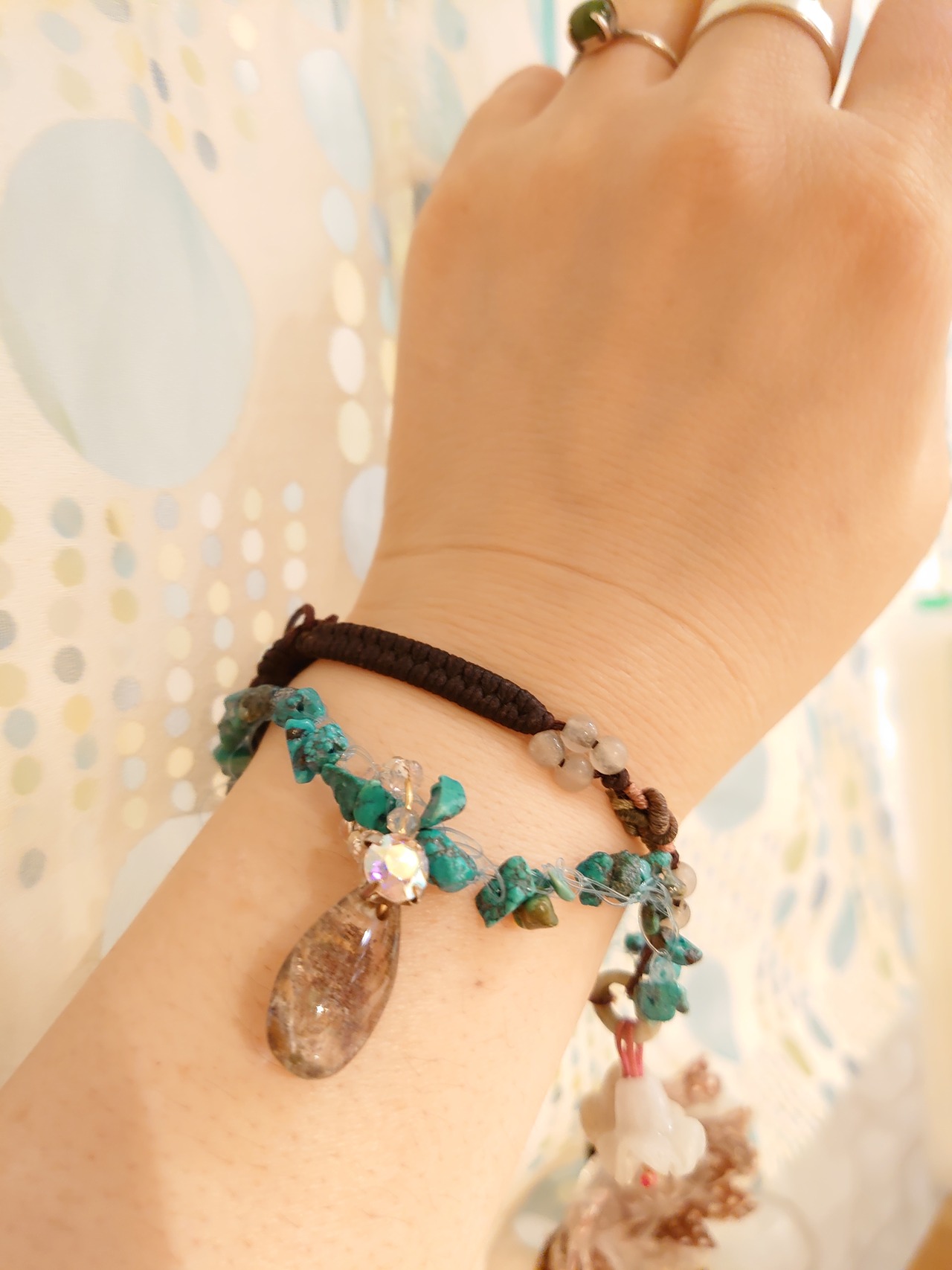 このブレスレットは、金運アップで知られる ブラジルのガーデンクオーツと、アメリカ産のターコイズをさざれで編み込んだユニークなデザインが特徴です。