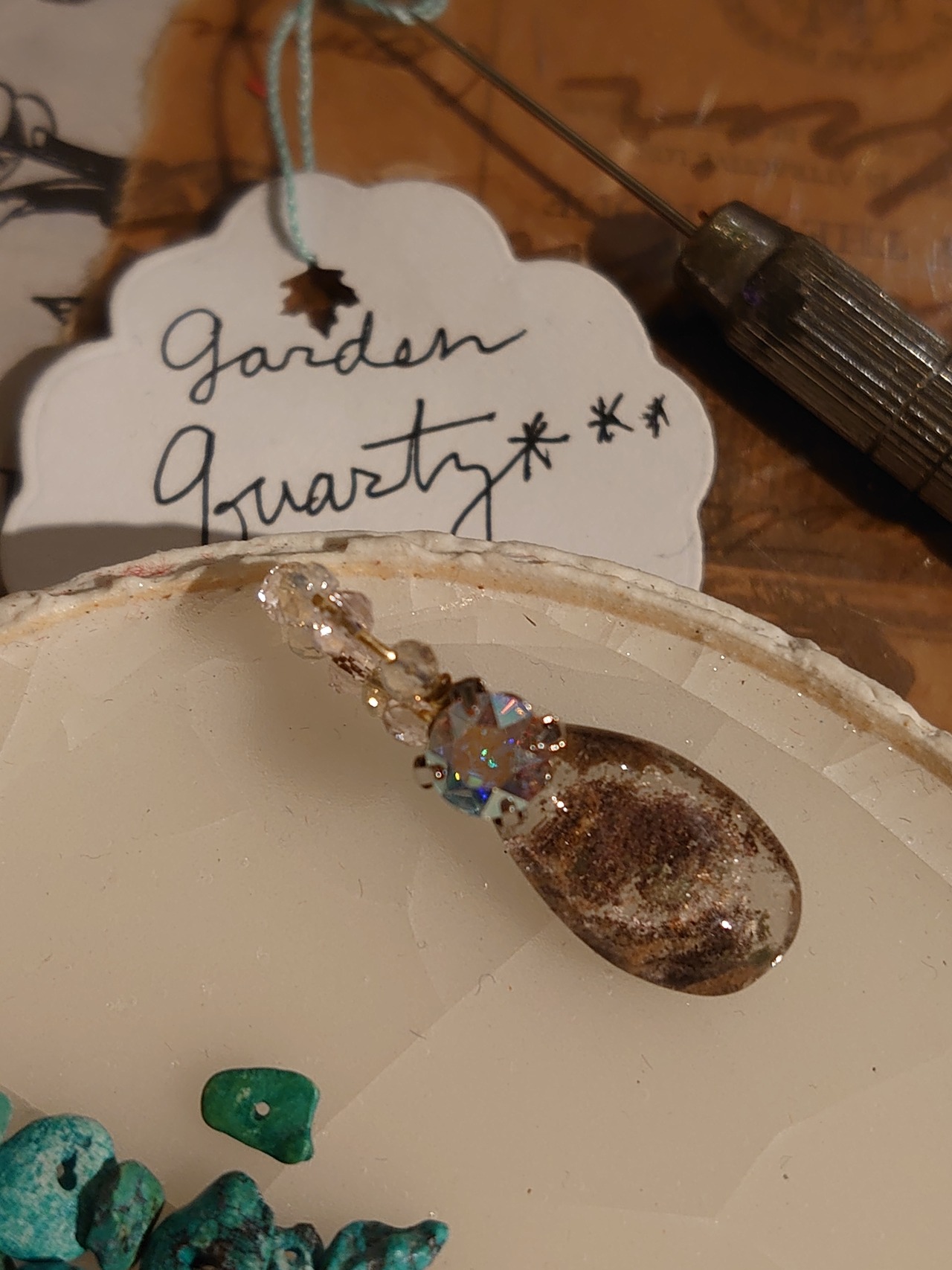 ガーデンクオーツの苔のような内包物の面白味、ターコイズの青緑色が見事に調和し、視覚的な魅力を引き立てます。