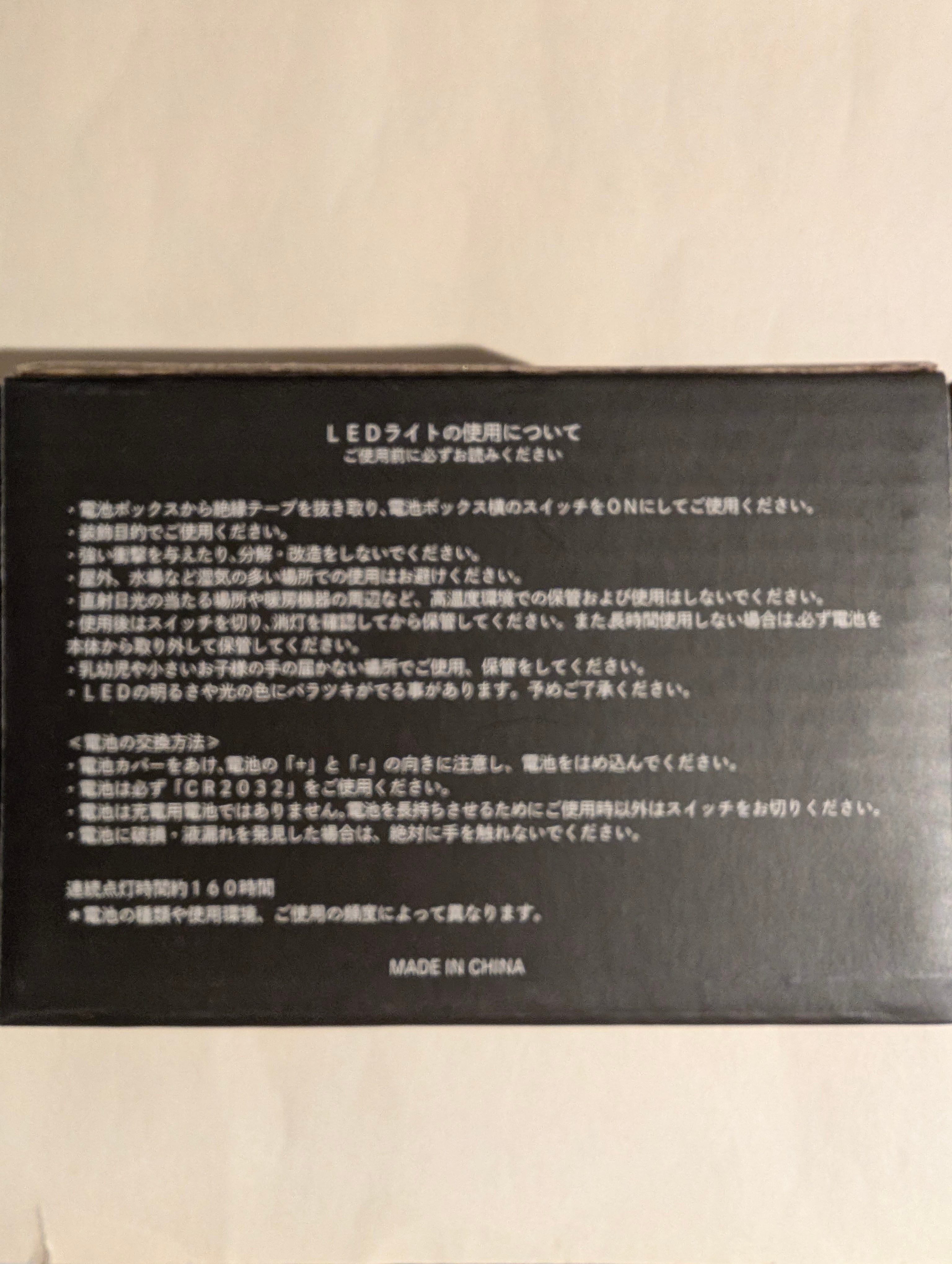 注意事項 ・装飾目的でご使用ください。・強い衝撃を与えたり、分解・改造をしないでください。・屋外、水場など湿気の多い場所での使用はお避けください。・直射日光の当たる場所や暖房機器の周辺など高温度環境での保管および使用はしないでください。・使用後はスイッチを切り、消灯を確認してから保管してください。また、長時間使用しない場合は、必ず電池を本体から取り外して保管してください。・乳幼児や小さいお子様の手の届かない場所でご使用、保管をしてください。・ LEDの明るさや光の色にバラツキがでる事があります。予めご了承ください。