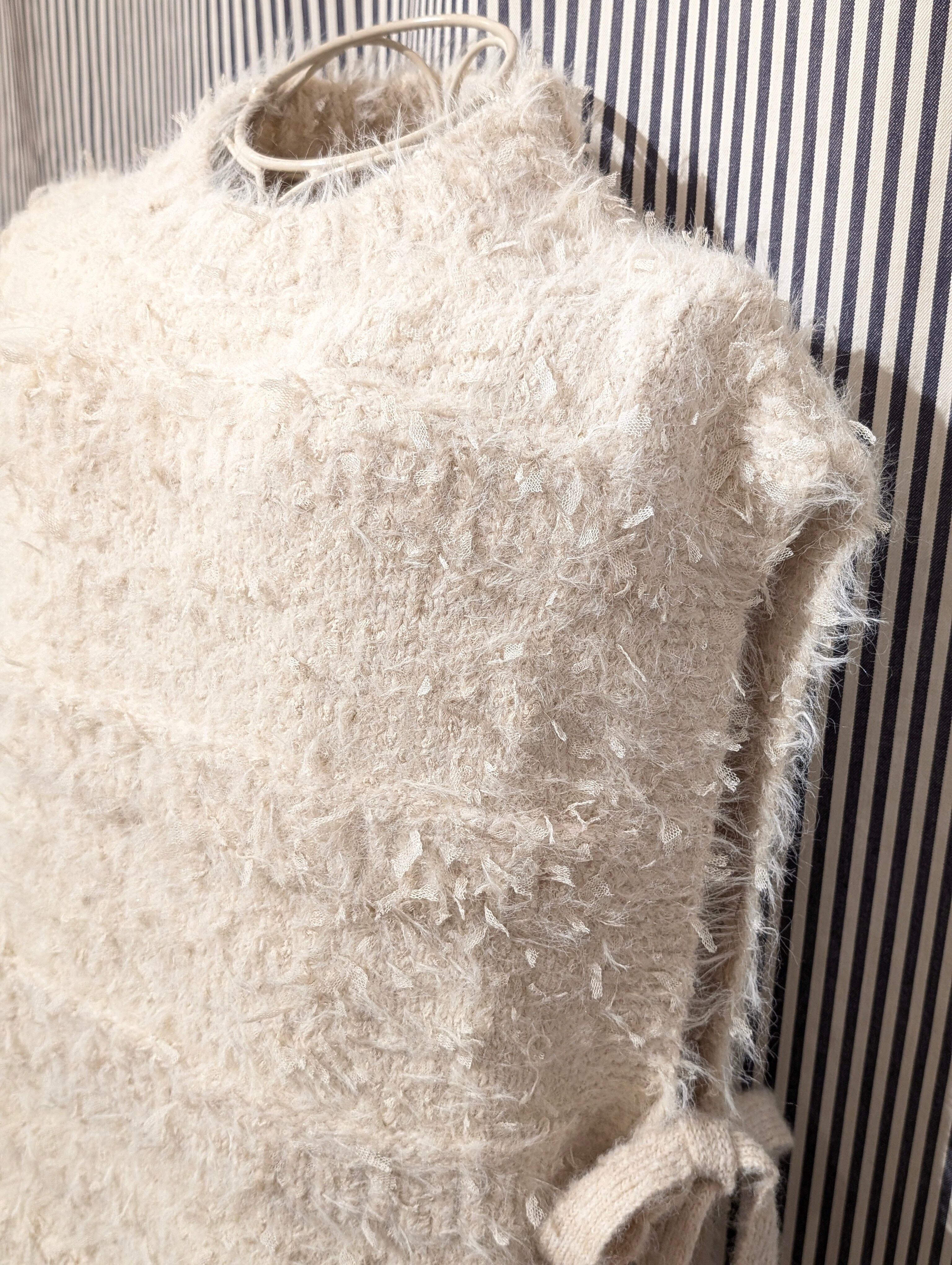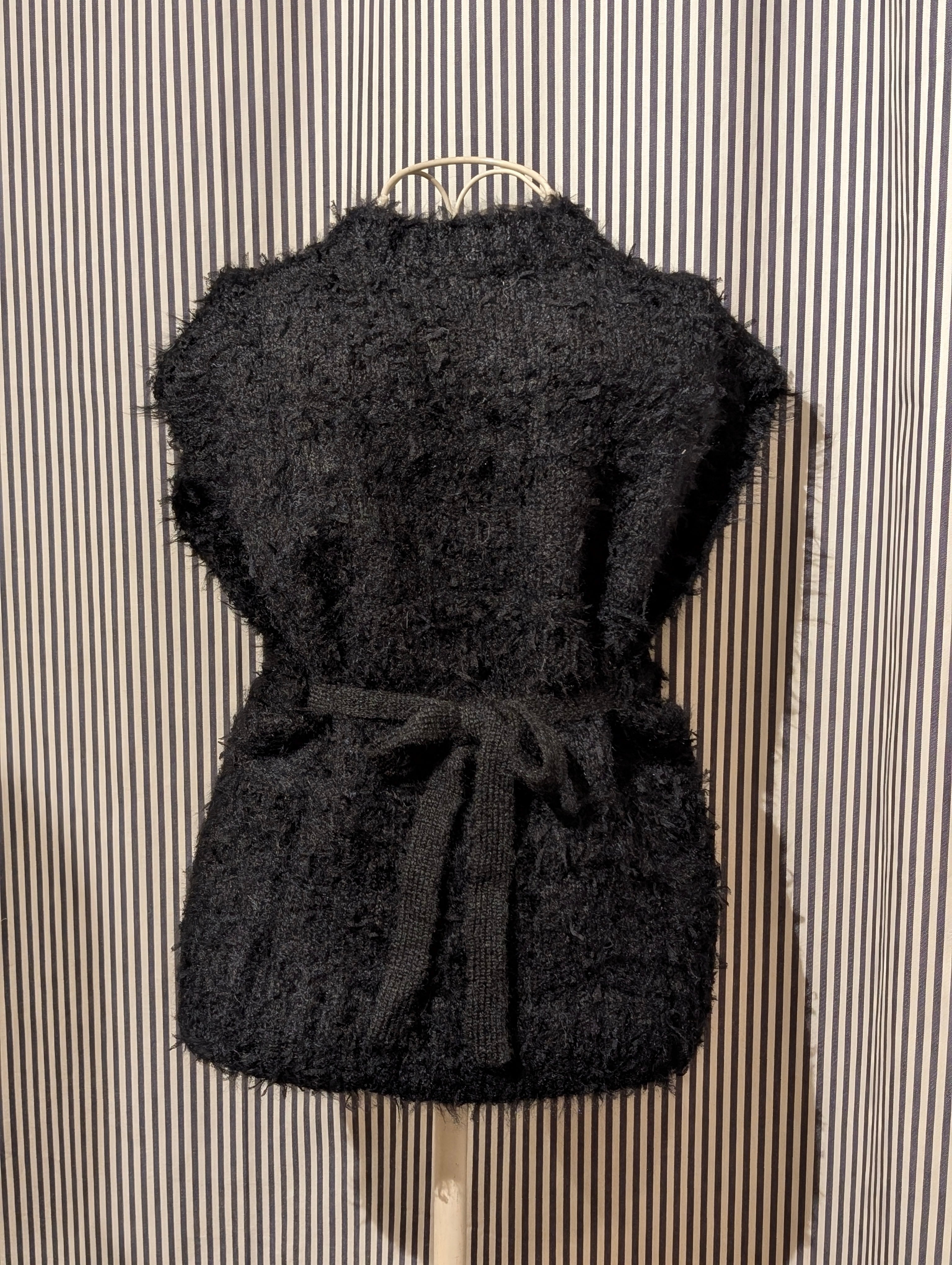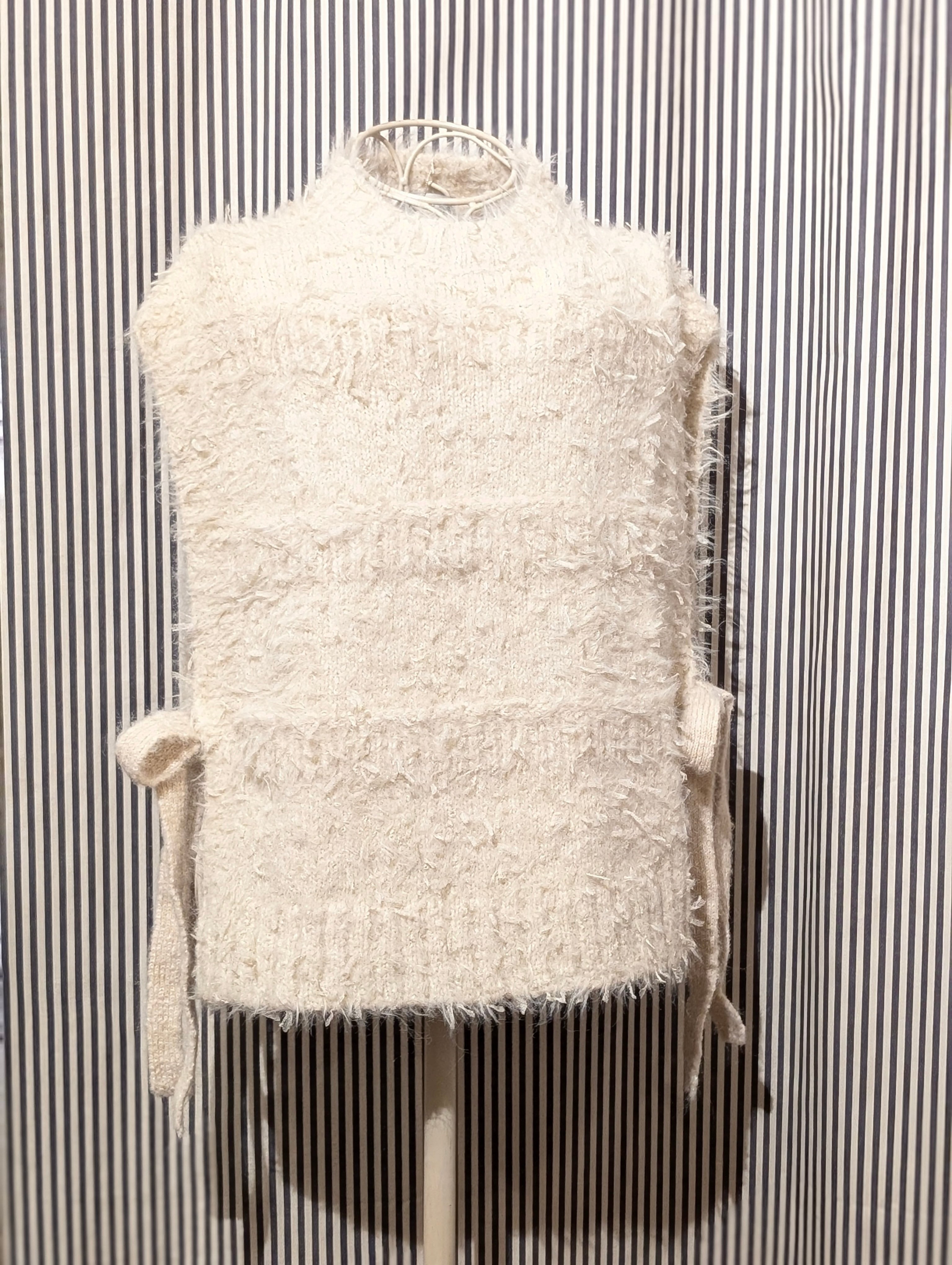 このニットベストは、ウエストでリボンを結ぶことでエレガントに着こなすこともできるアイテムです。