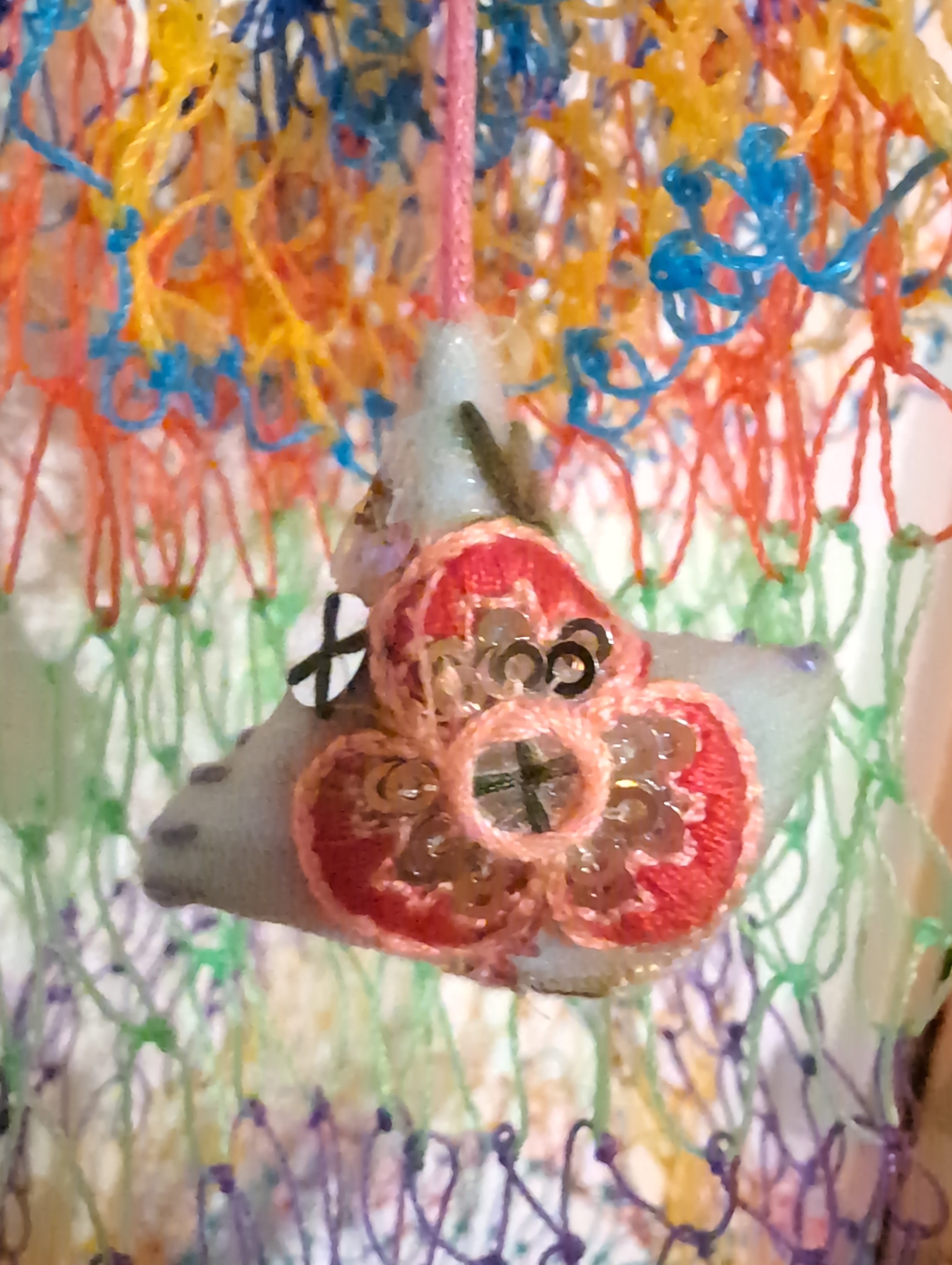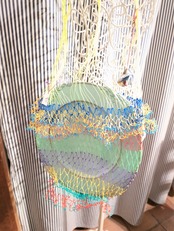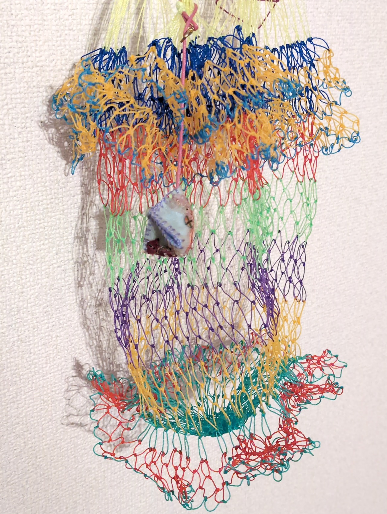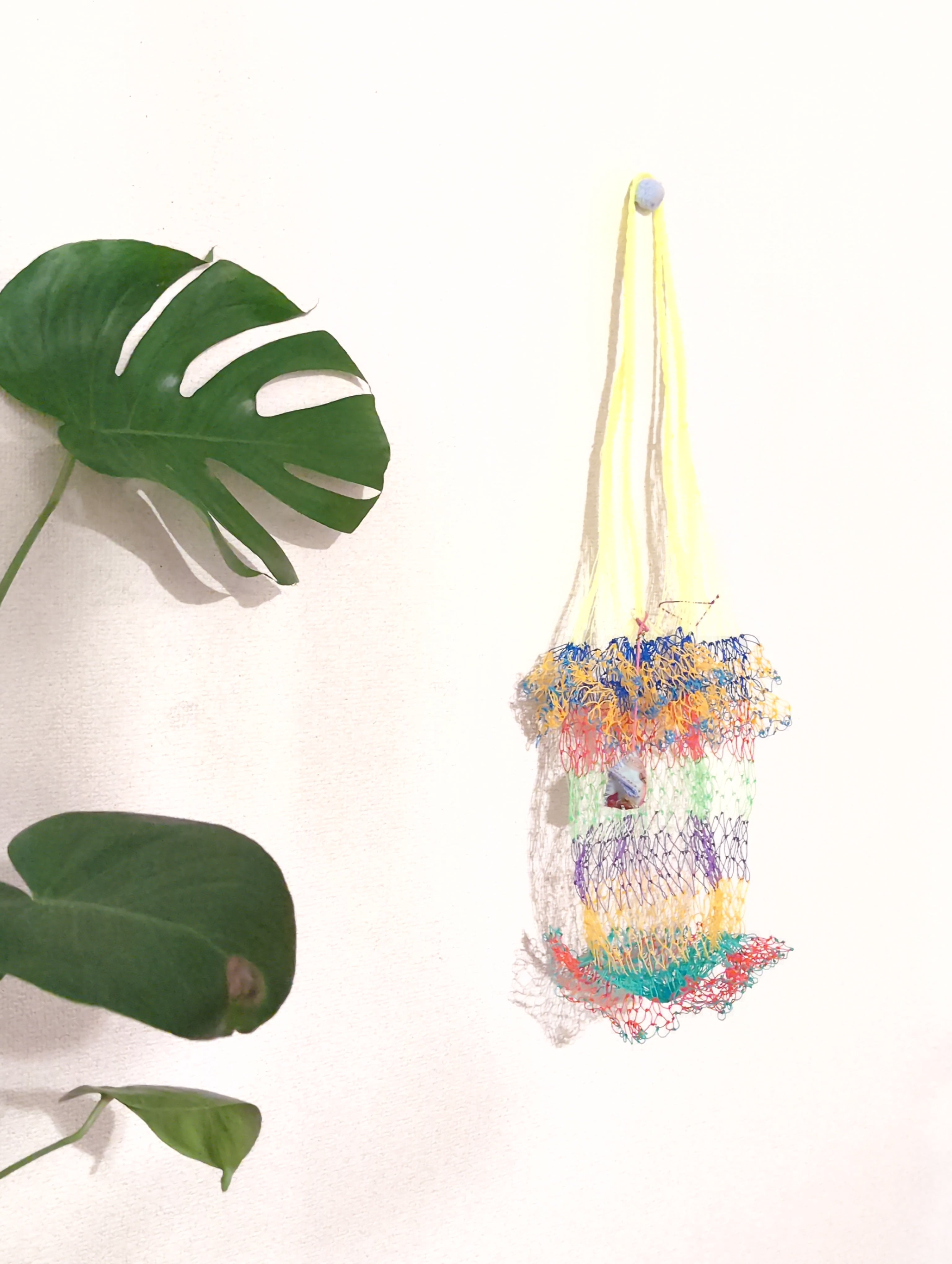 網 バッグ あみあみフリフリ ネオンカラーでカラフルなタイの漁師さんの編みバッグにコインケースのチャーム付き 中に巾着やあずま袋を入れてもおしゃれ! コラージュ timo.co 作品