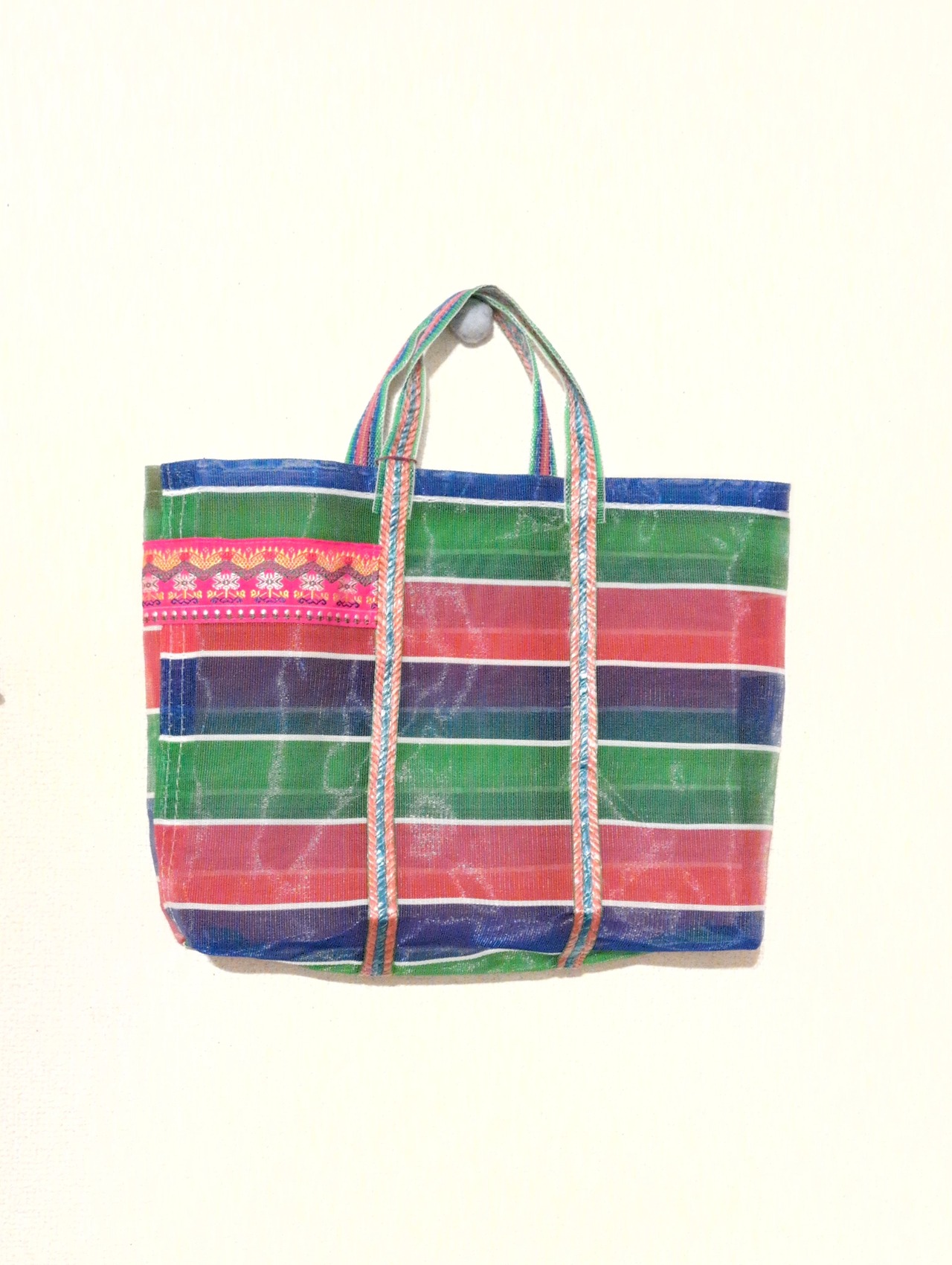 シースルーバッグ 台湾のスタンダードなメッシュバッグにタイの山岳民族のテープをおしゃれにアレンジ! 中に巾着やあずま袋を入れてもおしゃれ! コラージュ timo.co 作品
