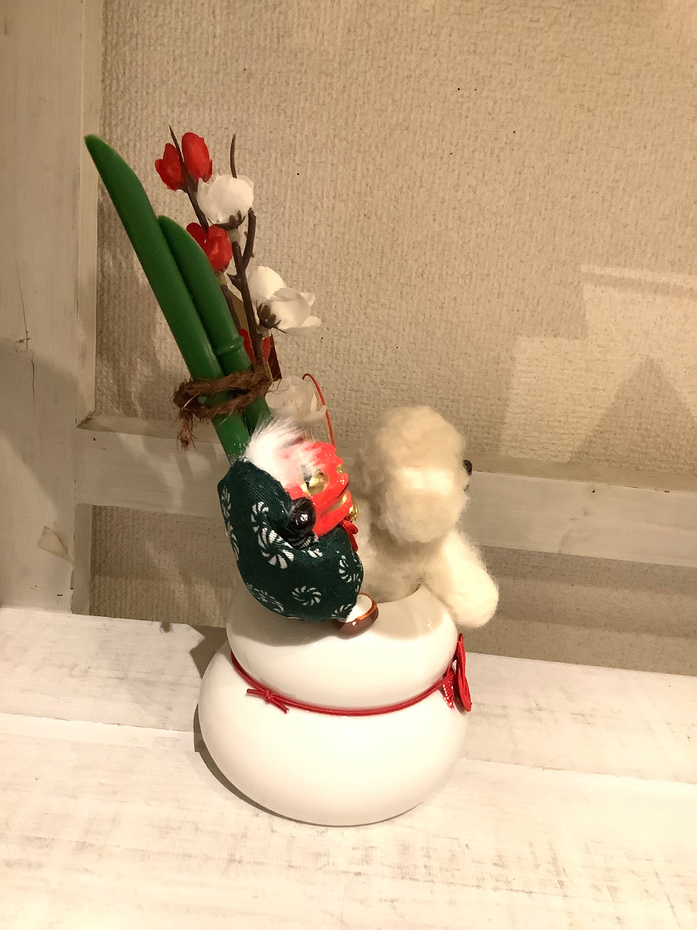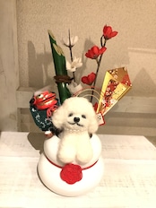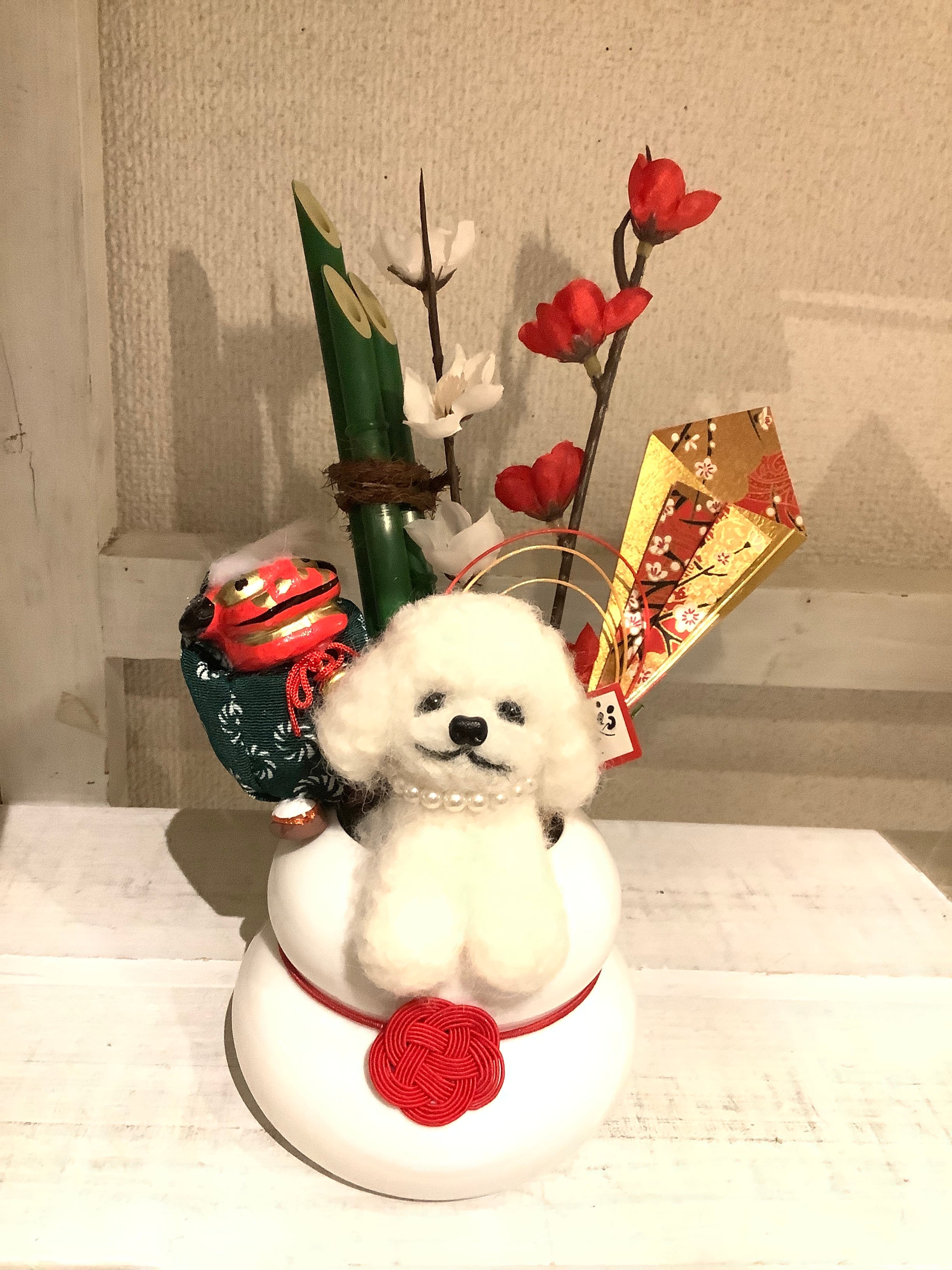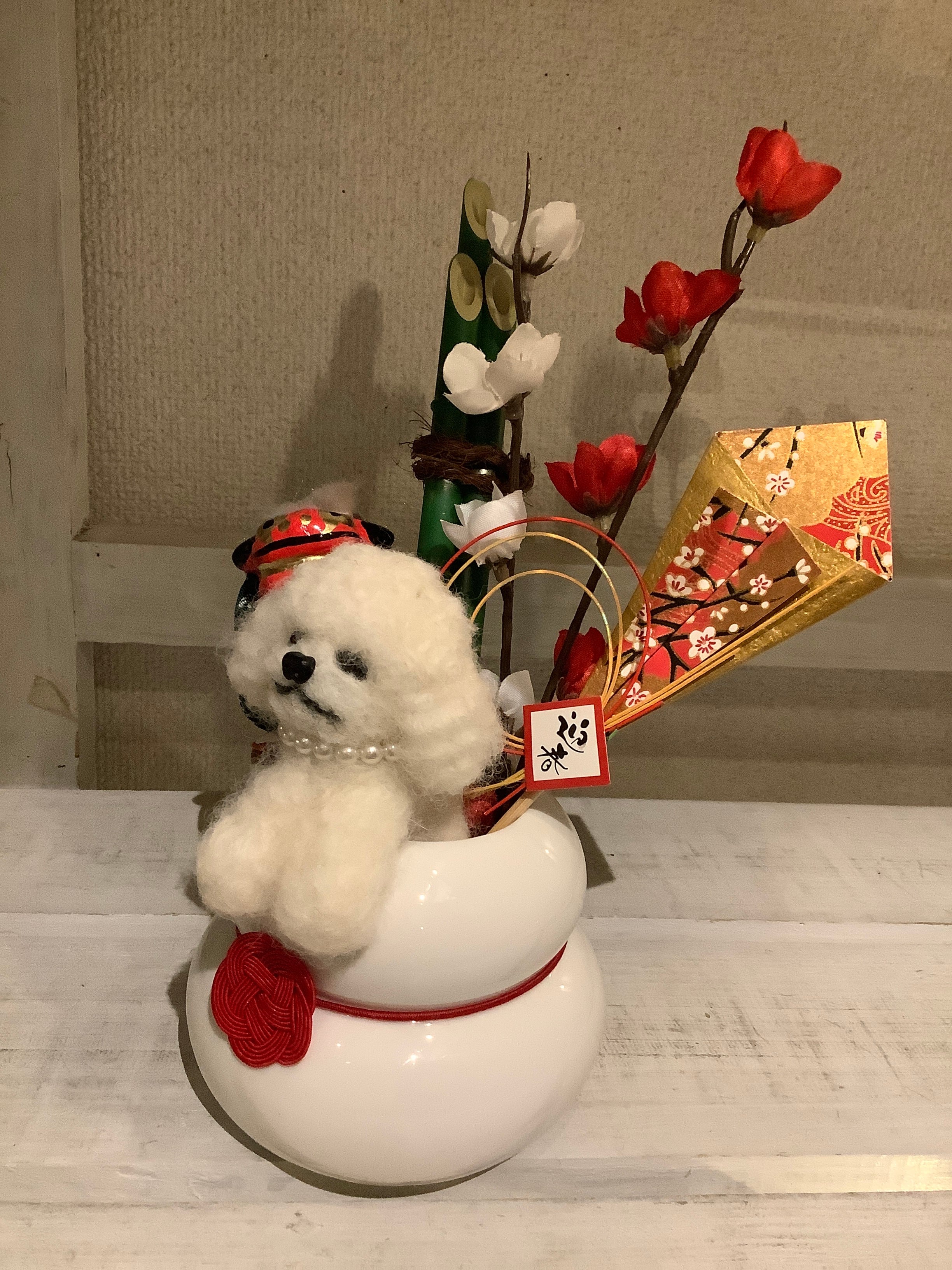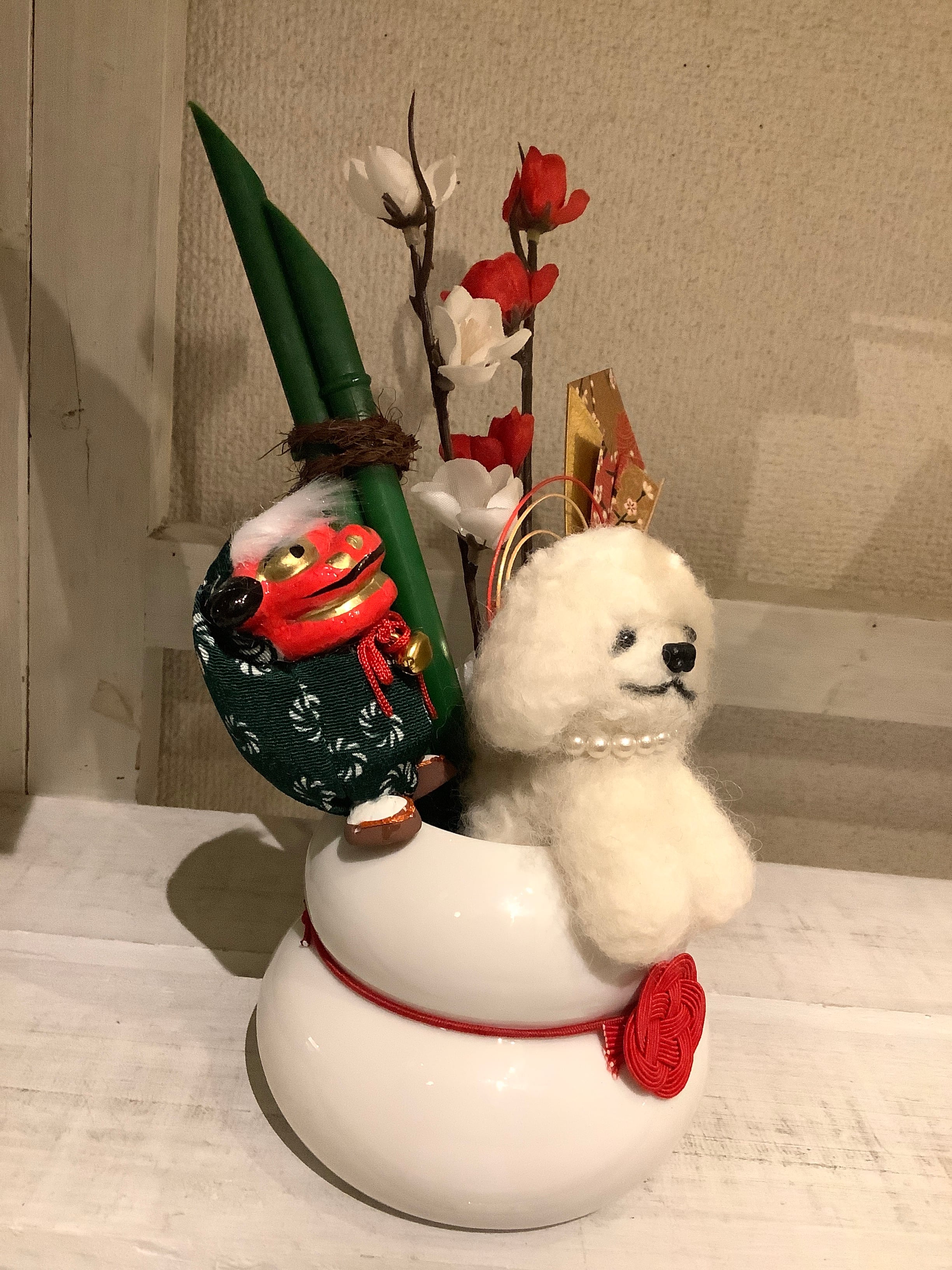 お正月飾りセット トイプードル ホワイト 羊毛フェルト ハンドメイド 一点もの petit balon オリジナル作品