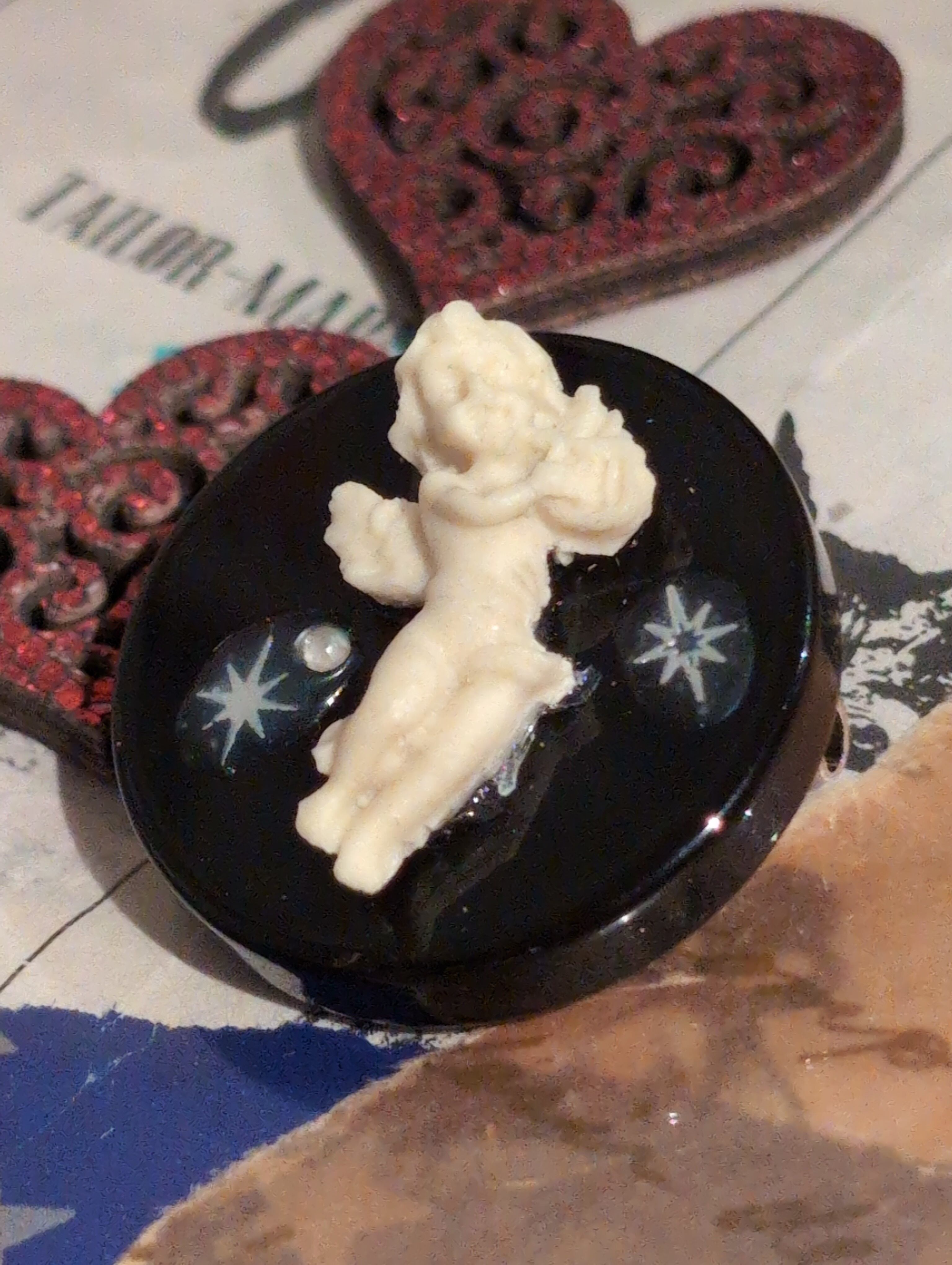 神秘的なブラックオニキスを使ったブローチは、エンジェルのコラージュが施された特別なデザインです。