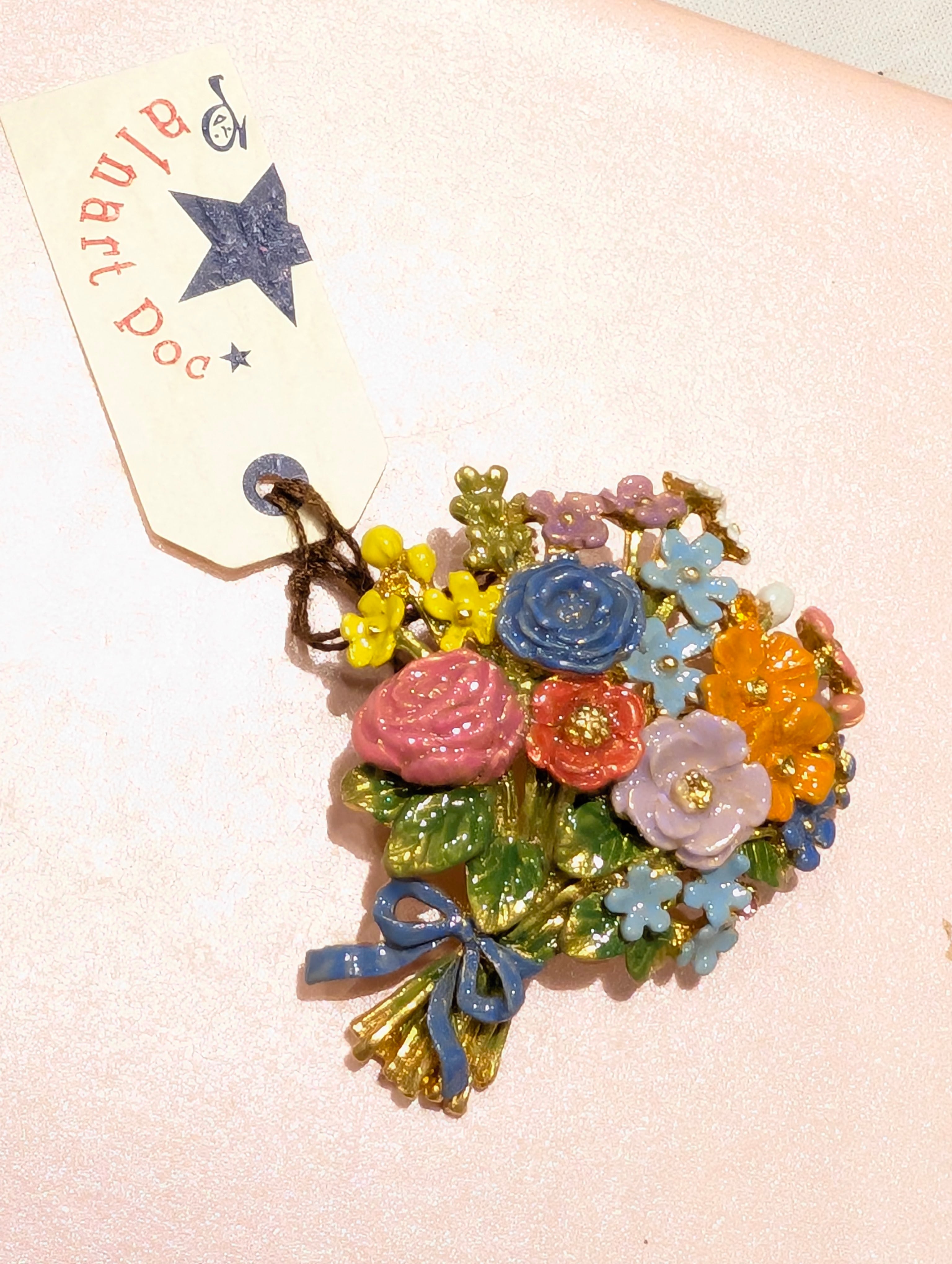 色とりどりの花々が咲き誇る庭の情景をブーケに仕立て、ブルーのリボンで束ねた華やかなブローチ。