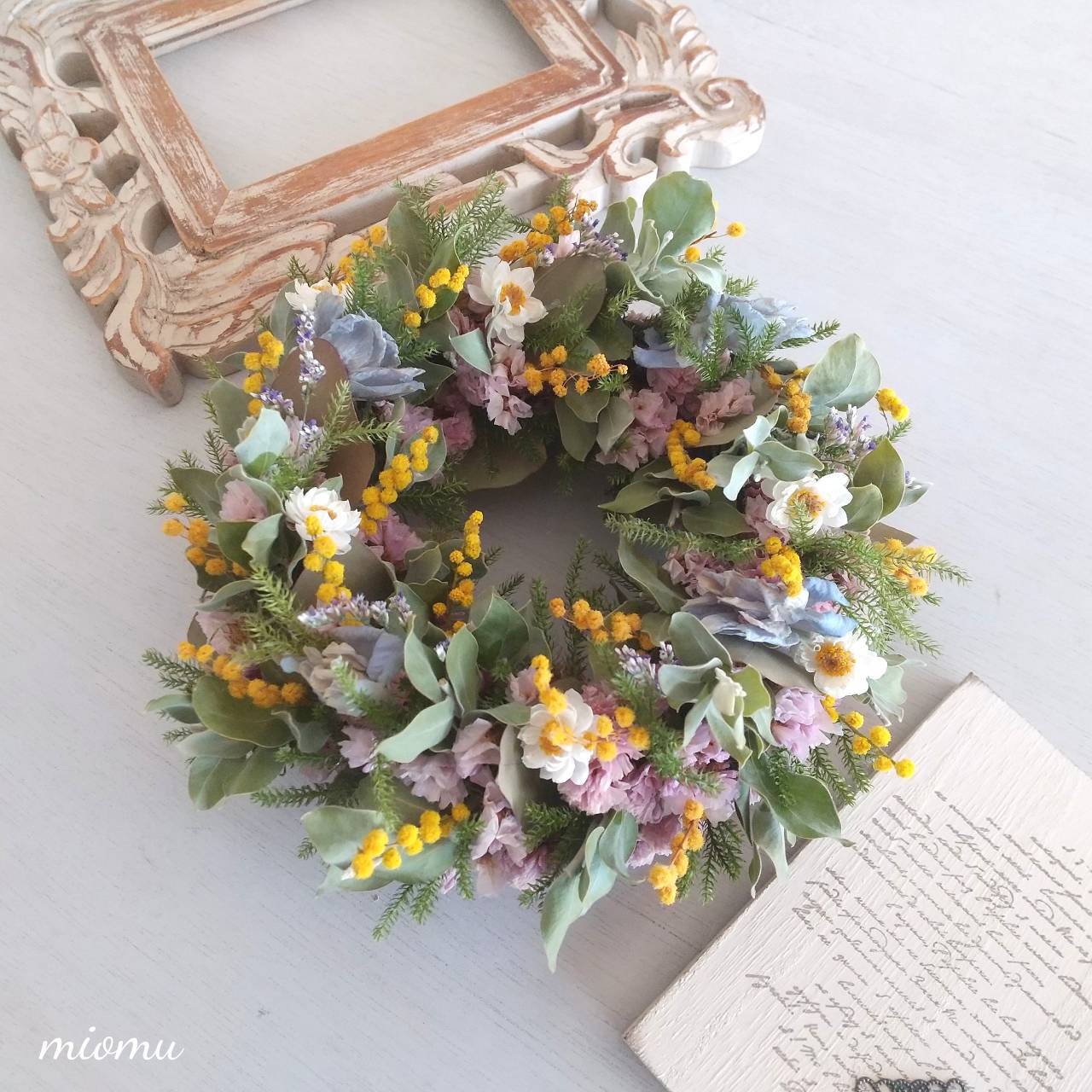 リース ドライフラワー ♥ミモザ丸18センチ径♥ ♥青とピンクと白と緑と黄色の爽やかな印象♥本物のお花が美しい miomu さんの 花 雑貨