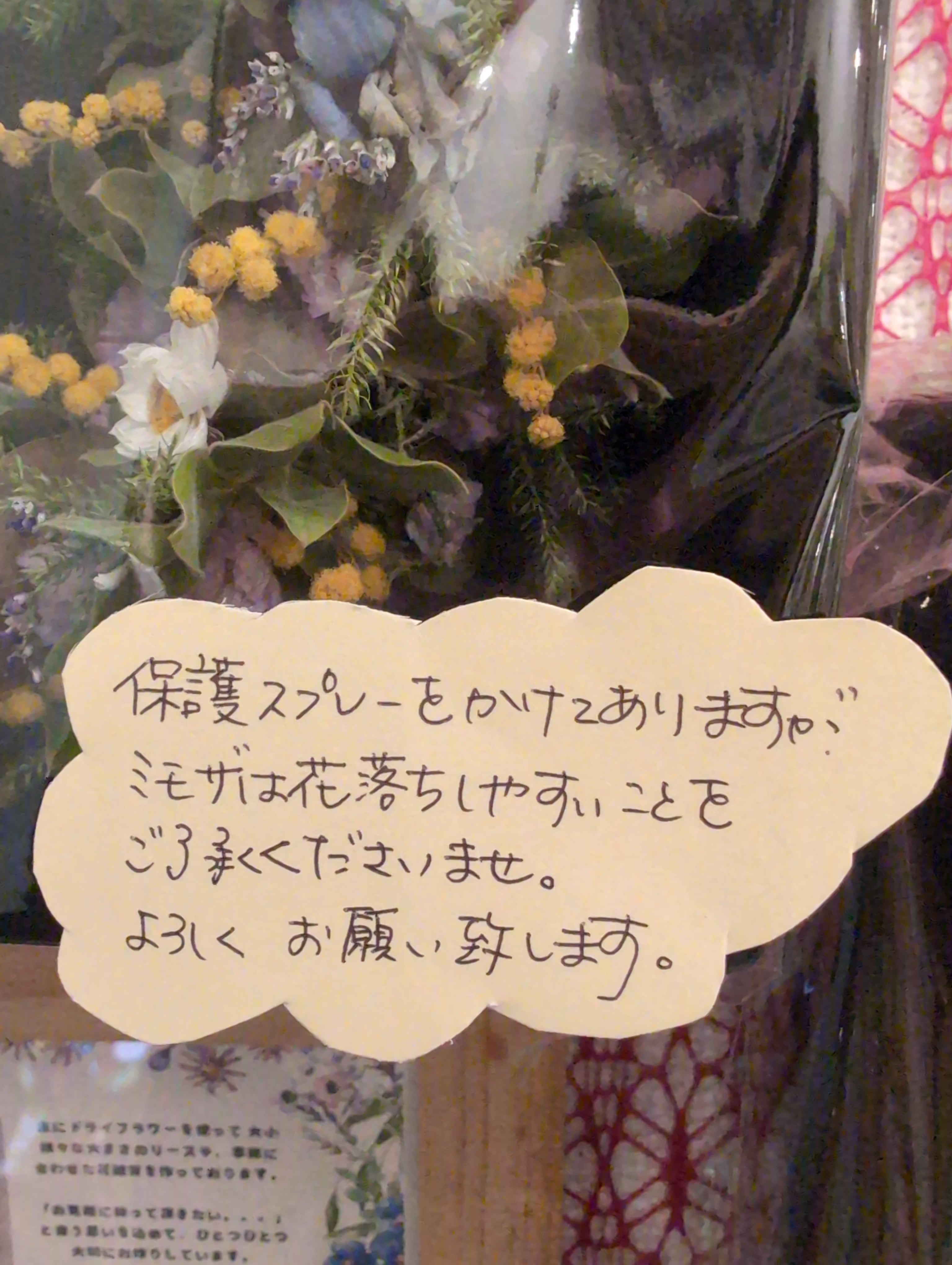 ドライフラワーは湿気と日光に弱いので、それらを避けて飾ってくださいませ。