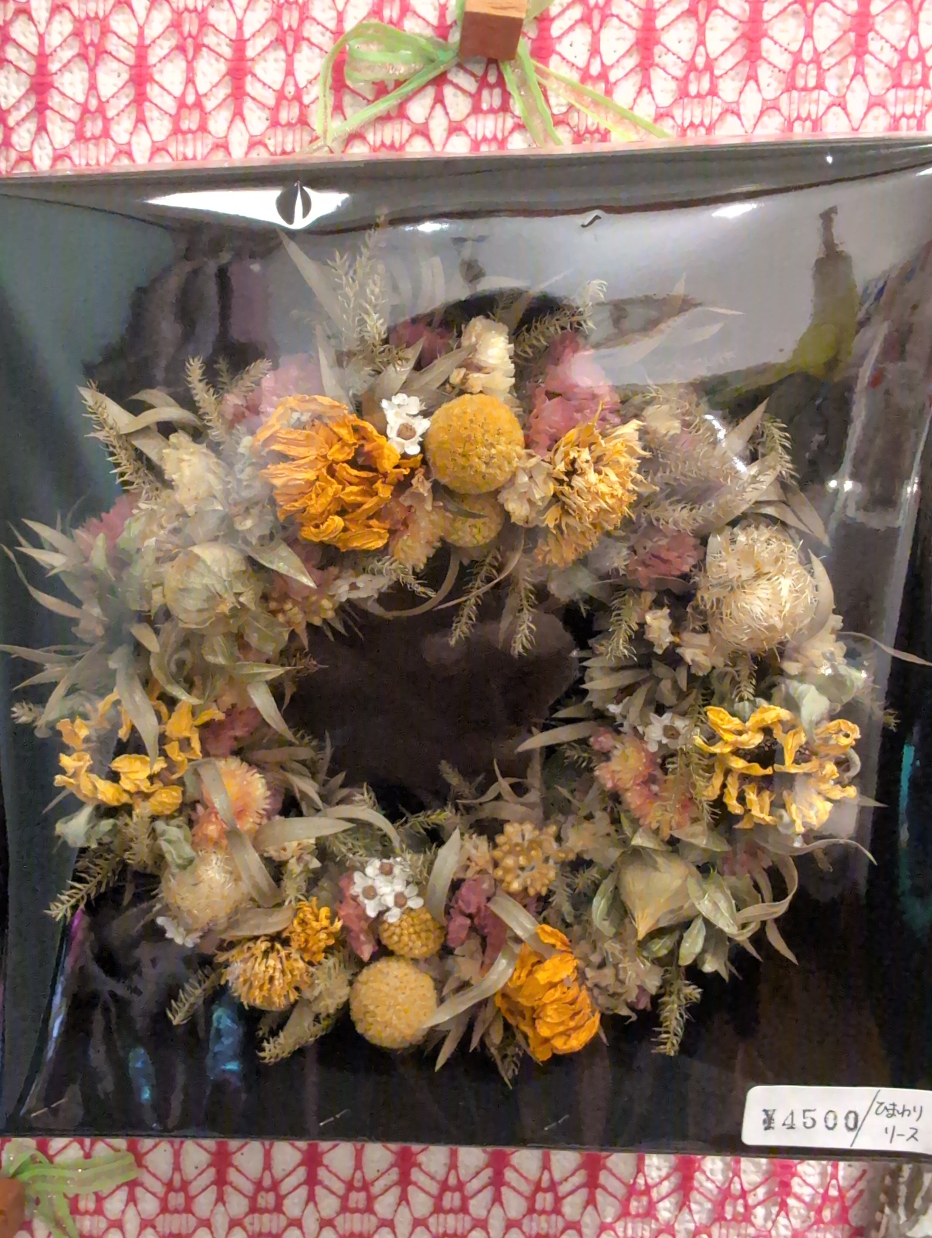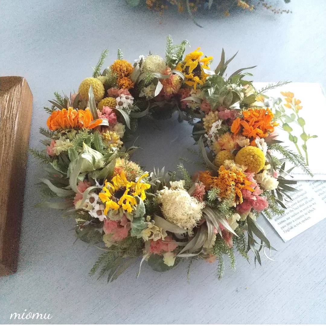 リース ドライフラワー ♥ひまわり18センチ径♥オレンジとピンクとホワイトとグリーンとイエローの爽やかな印象♥本物のお花が美しい miomu さんの 花 雑貨
