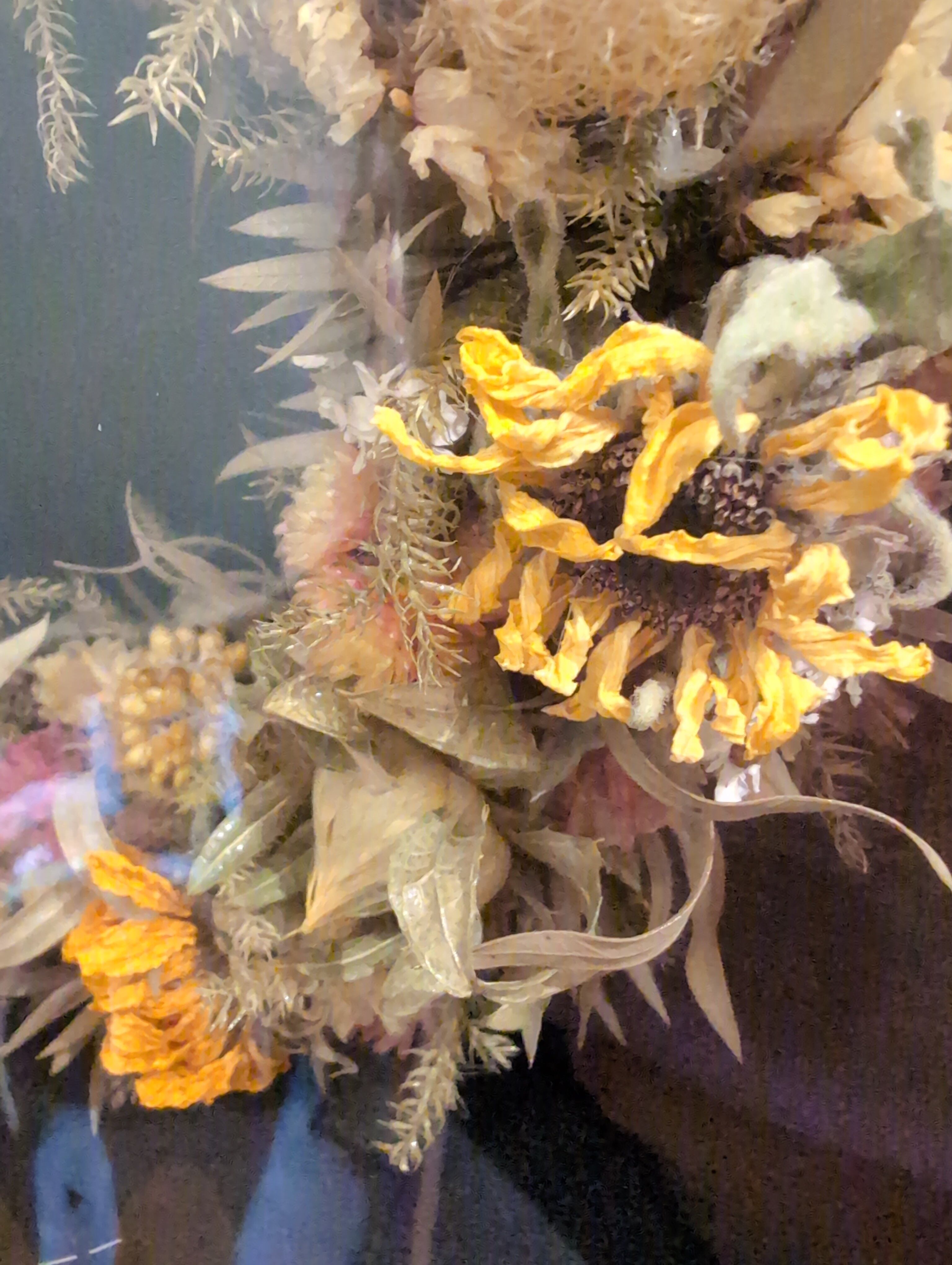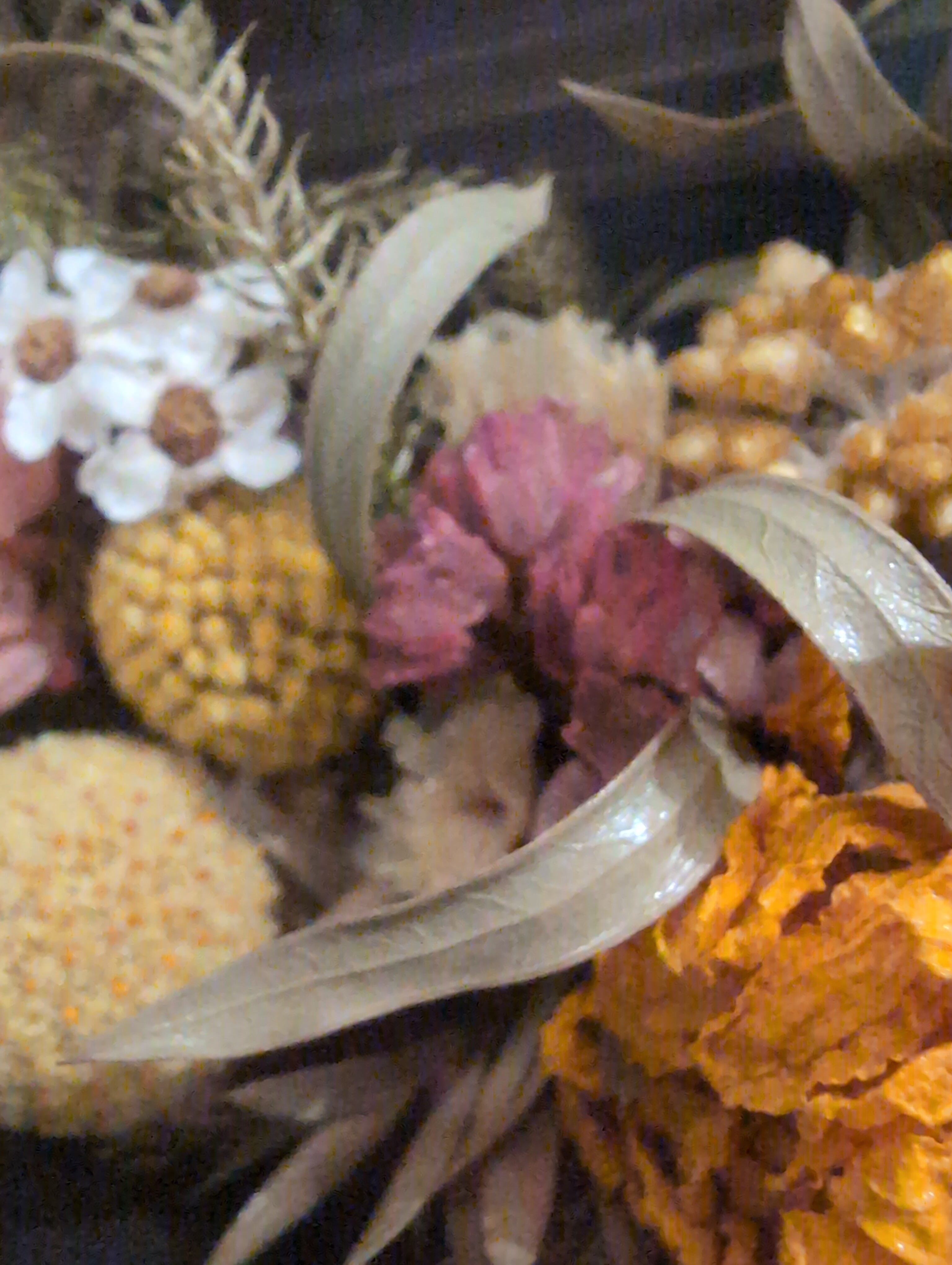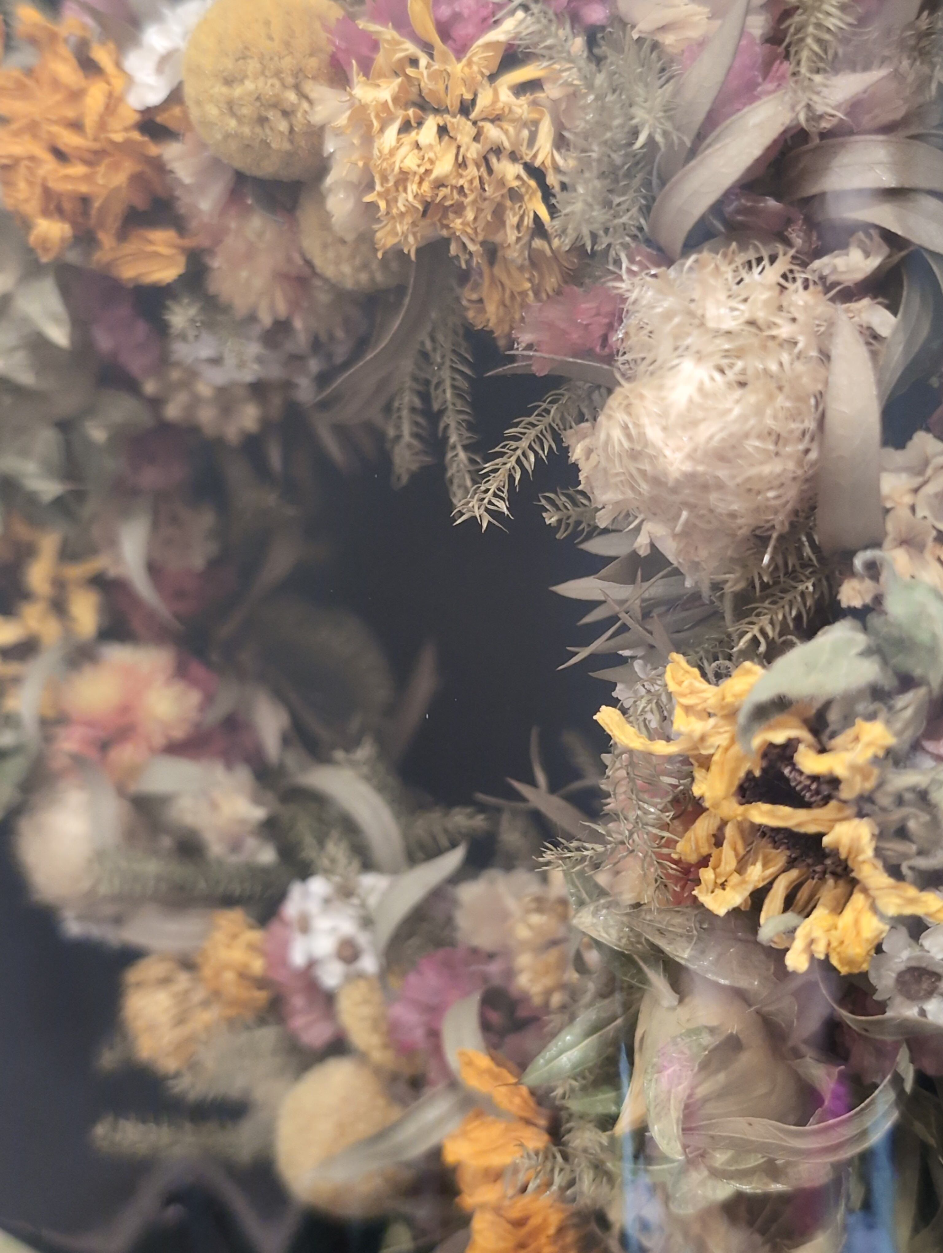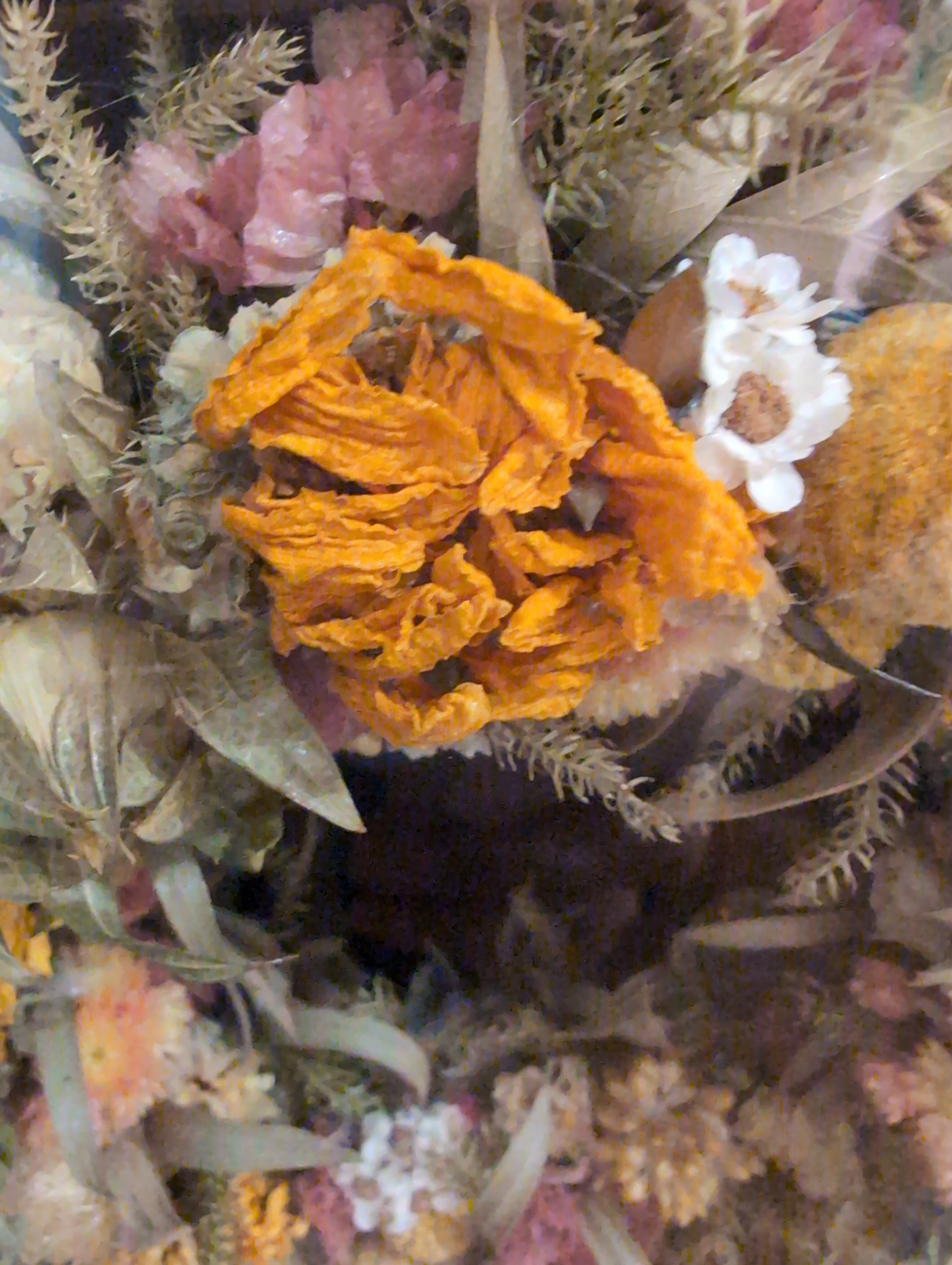 オレンジ、ピンク、イエロー、グリーン、そしてホワイトまでもバランスよく組み合わさった色合いにひまわりがポイントになっているこのリースは、まるで夏の陽射しのように明るく、あなたの生活空間に爽やかな印象を与えます。
