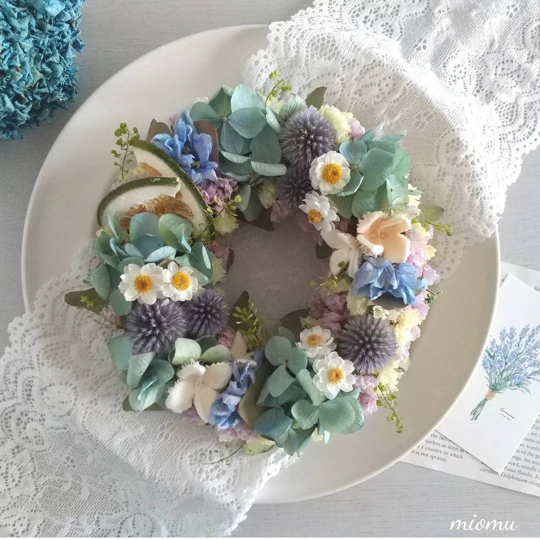 miomuさんの「♥紫陽花と果実♥」は、一つ一つ心を込めて手作業で作られた特別なアイテムです。ブルー、パープル、ホワイト、グリーン、イエローが織りなす鮮やかな色合いが、まるで春から梅雨のころの庭のような静けさを演出します。本物のお花を使用した美しさが、あなたの生活空間を華やかに彩り、癒しと活力を与えてくれることでしょう。