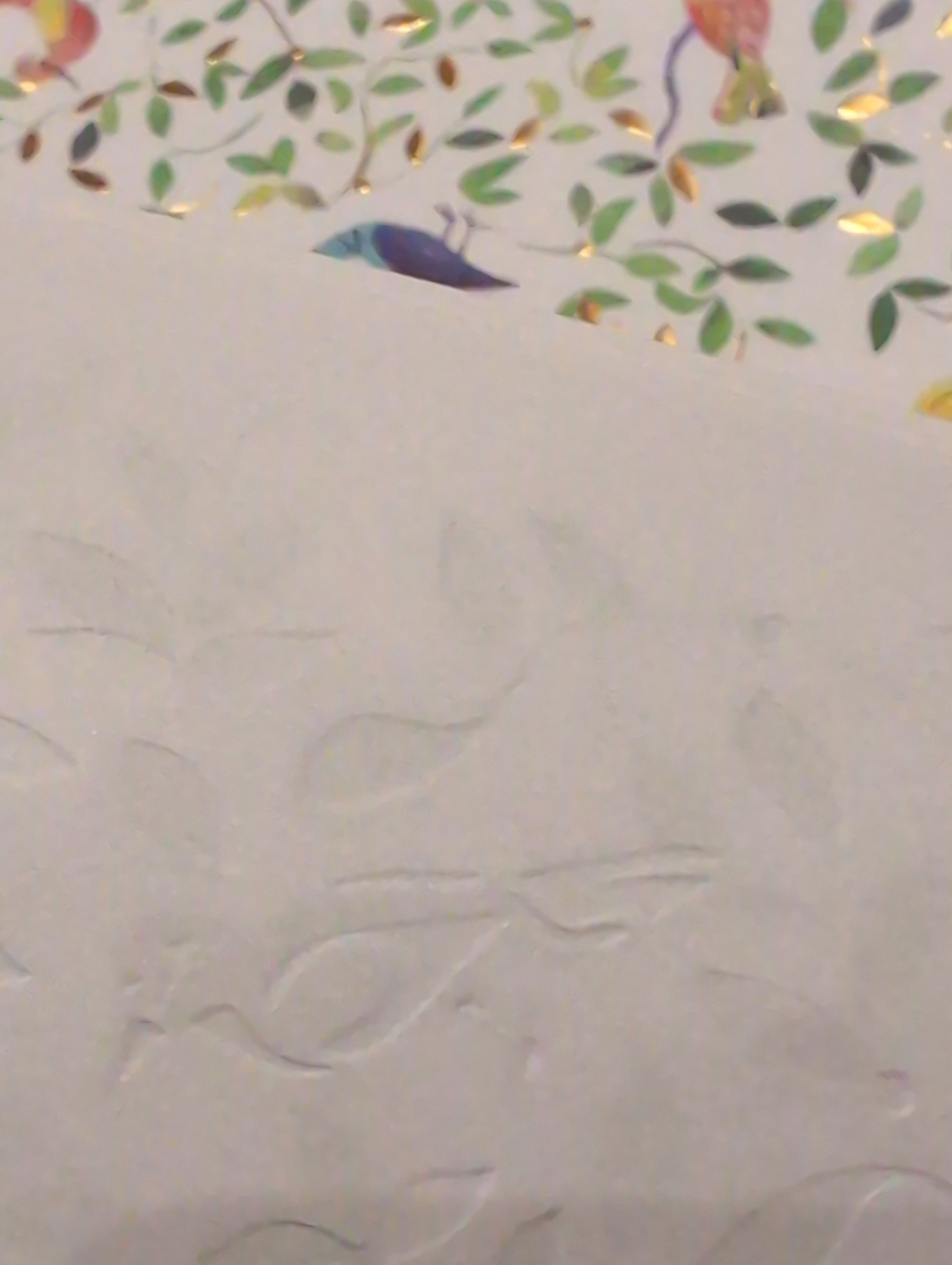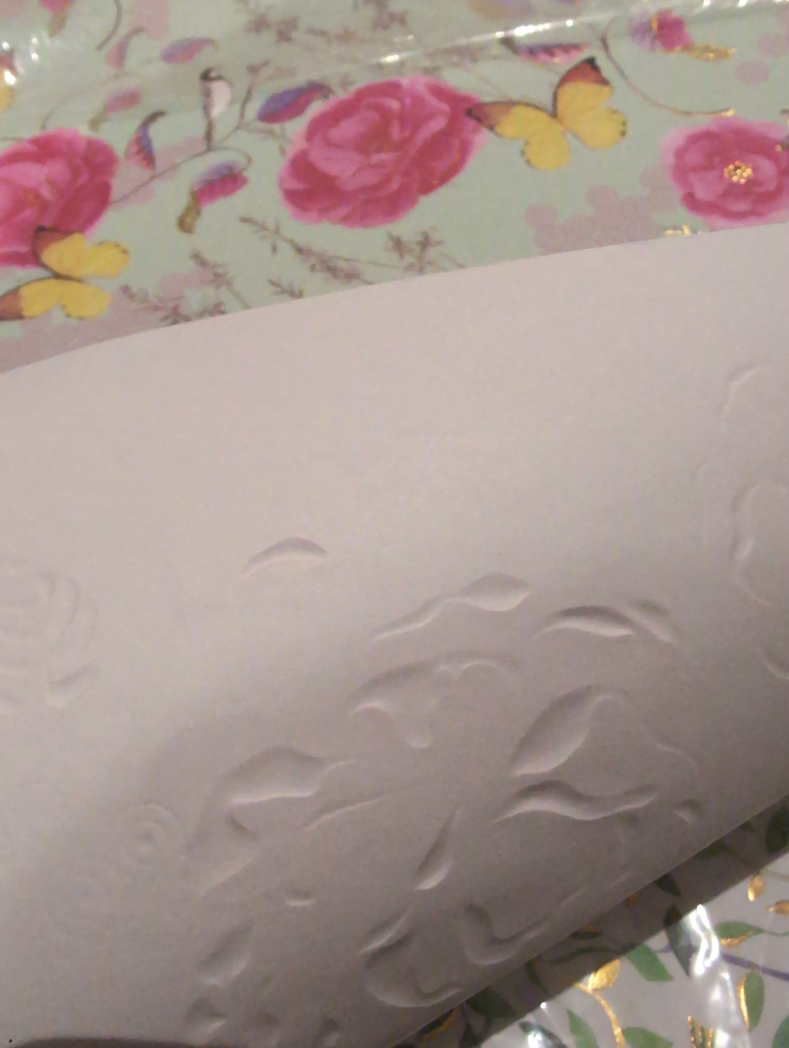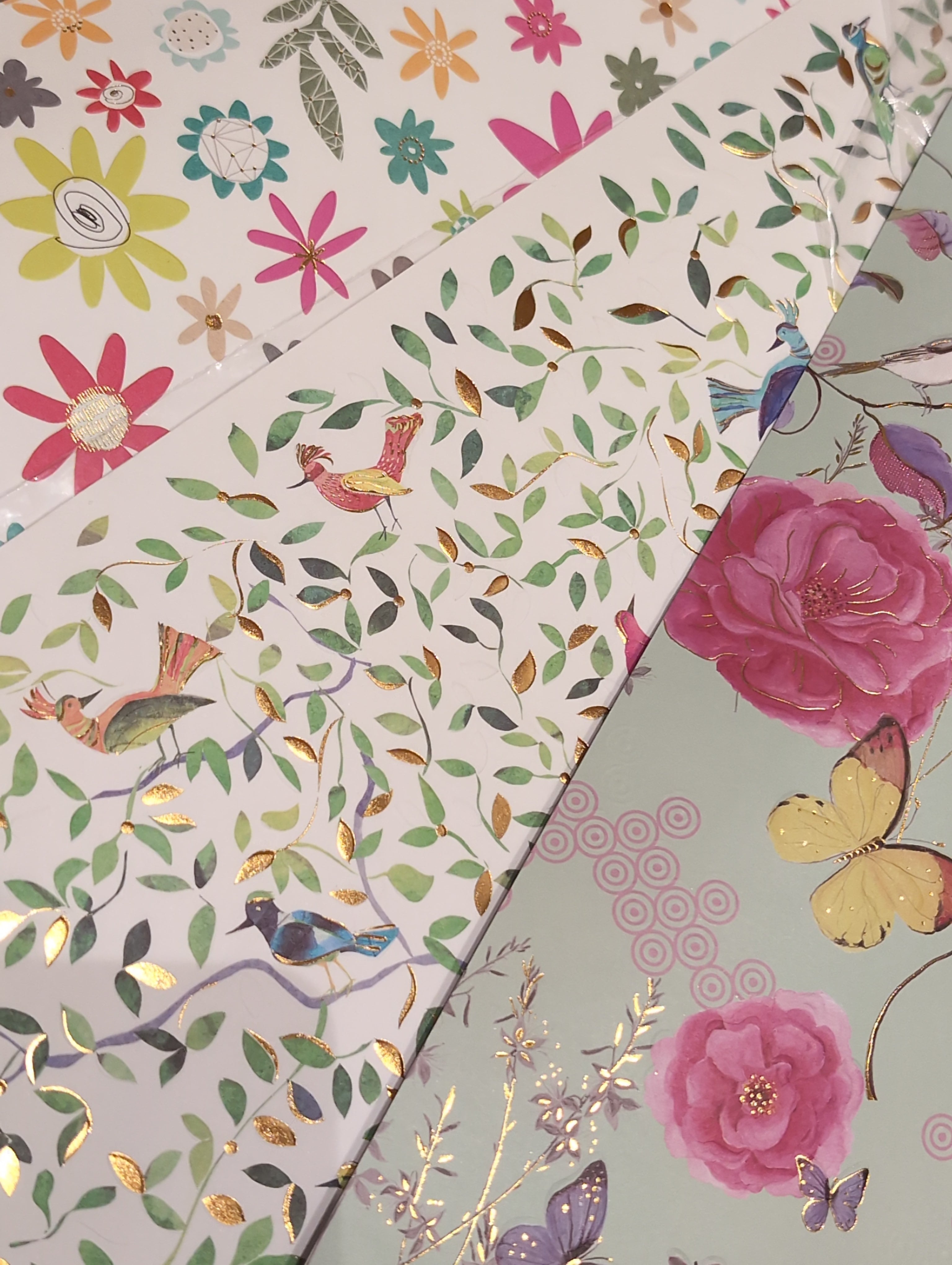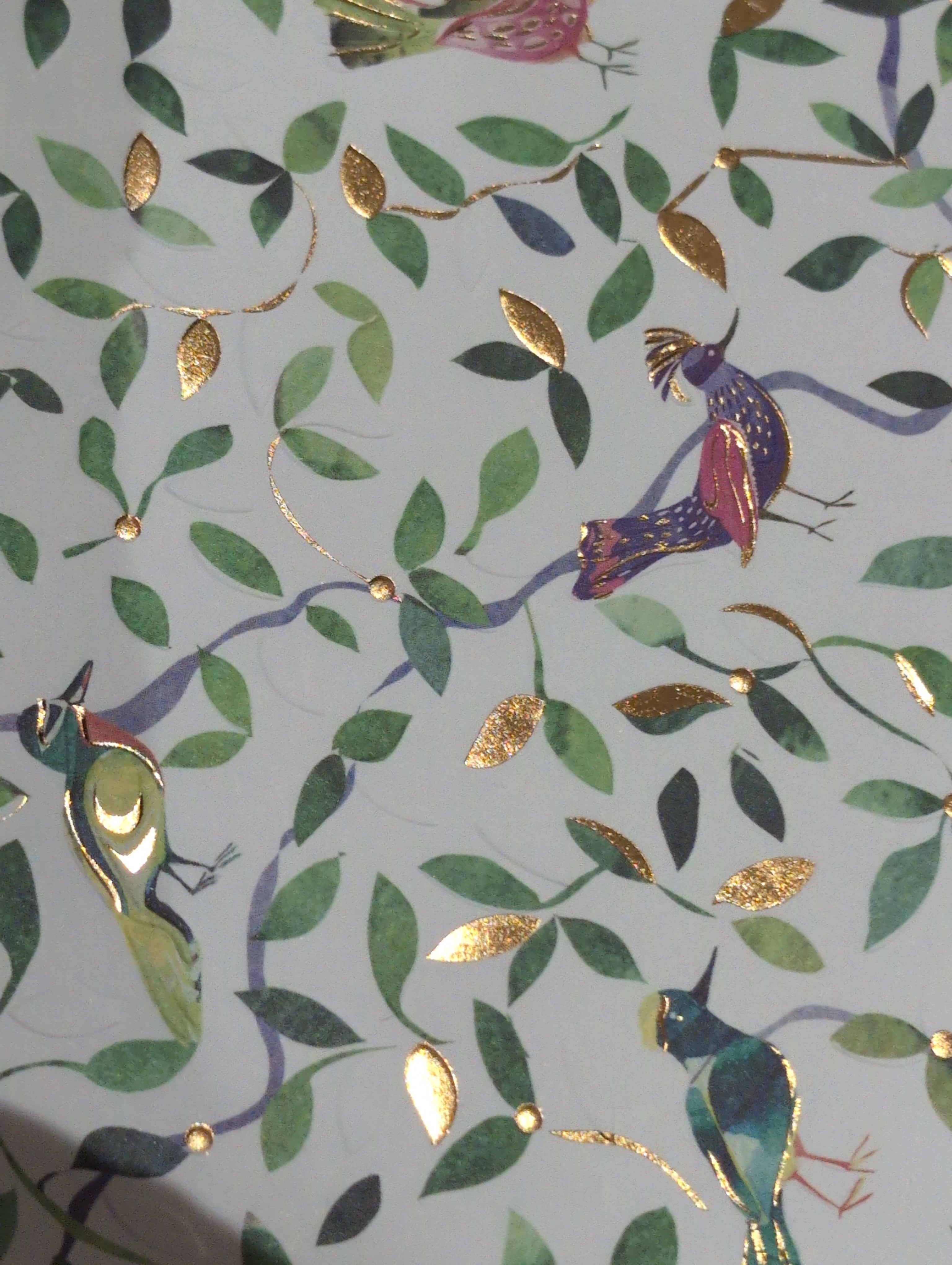 包装紙 ラッピングペーパー エンボスのある立体レリーフがうつくしく素晴らしい立体印刷紙。鳥と蝶と花、鳥と葉っぱ、カラフルな花柄