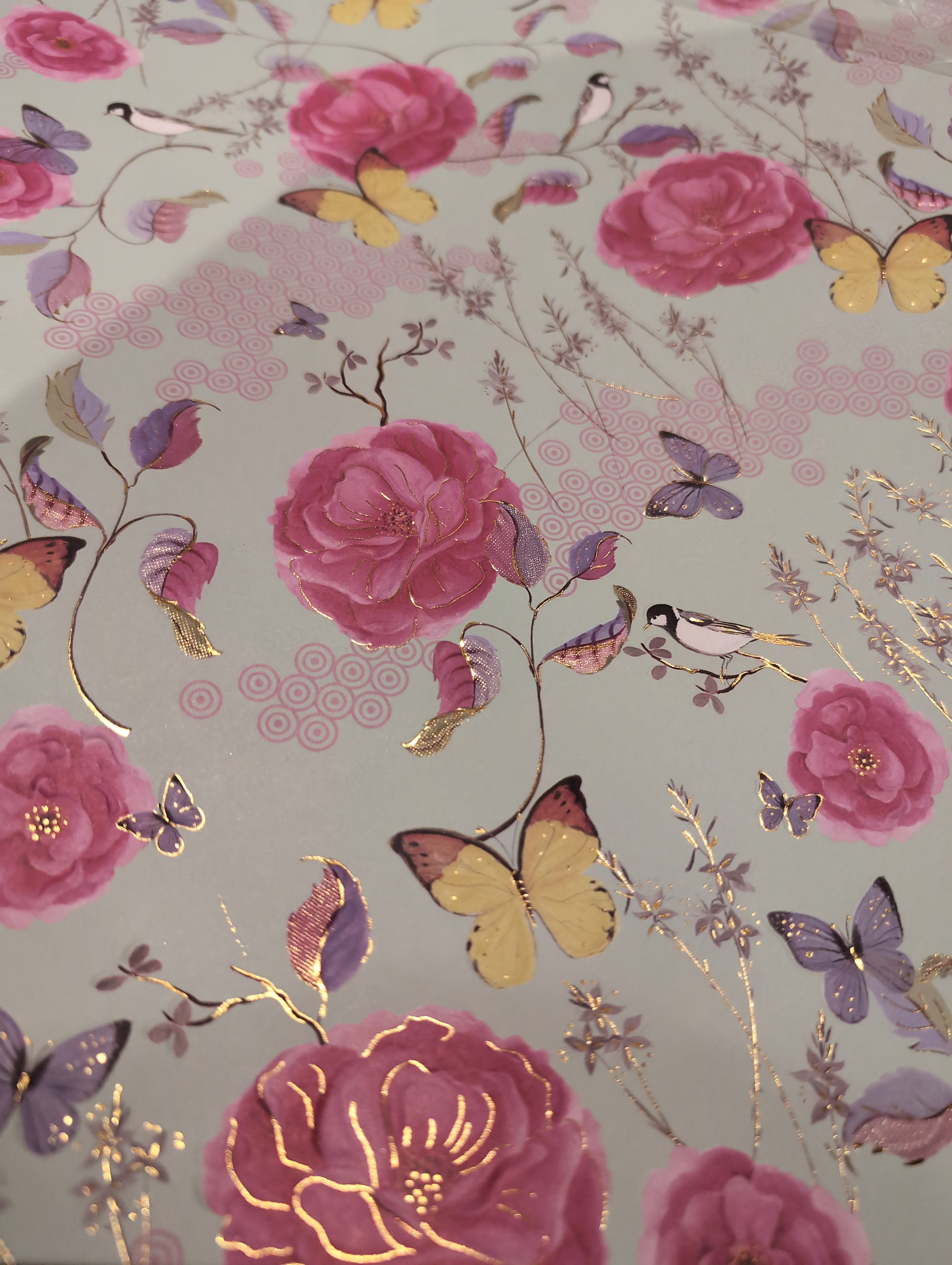本商品は、数年前にイスラエルから日本に輸入された美しいデザインのラッピングペーパーです。エンボス加工が施された立体レリーフが、鳥や蝶、花、葉っぱを描き出し、カラフルな花柄が見事に調和します。