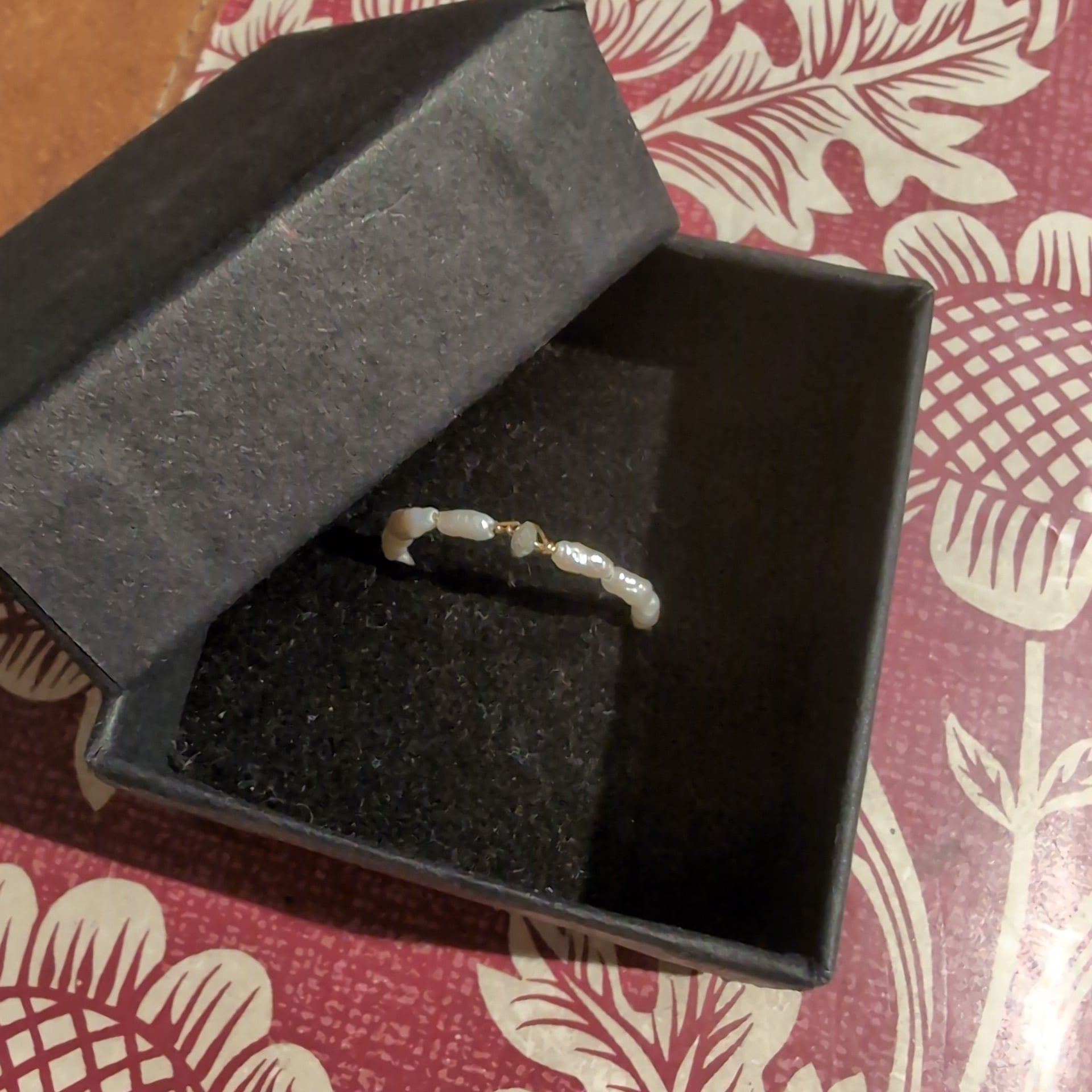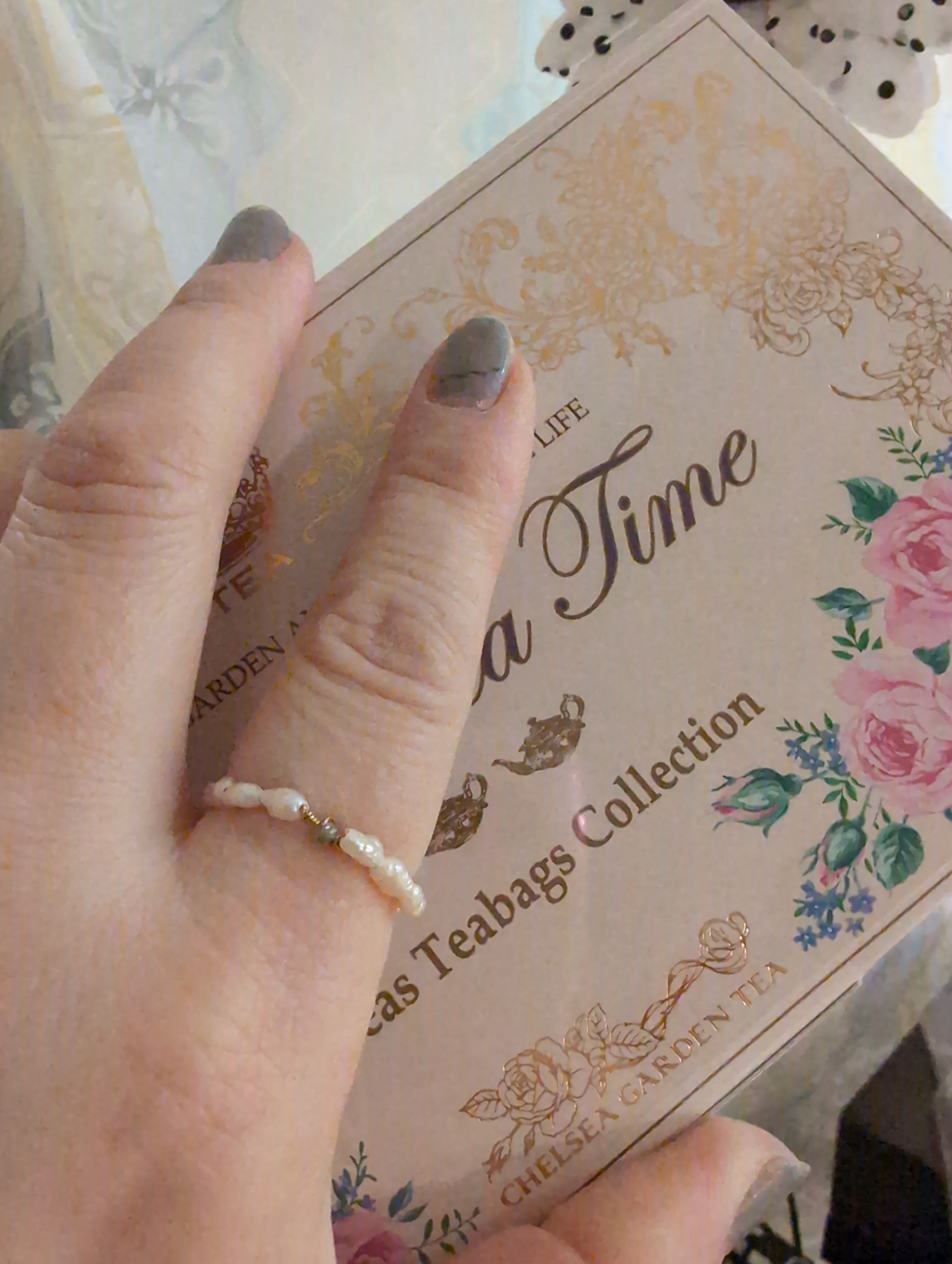 グレーのダイヤモンド原石と天然淡水ライスパールを使用したこのオリジナルリングは、あなたの手元を華やかに演出します。