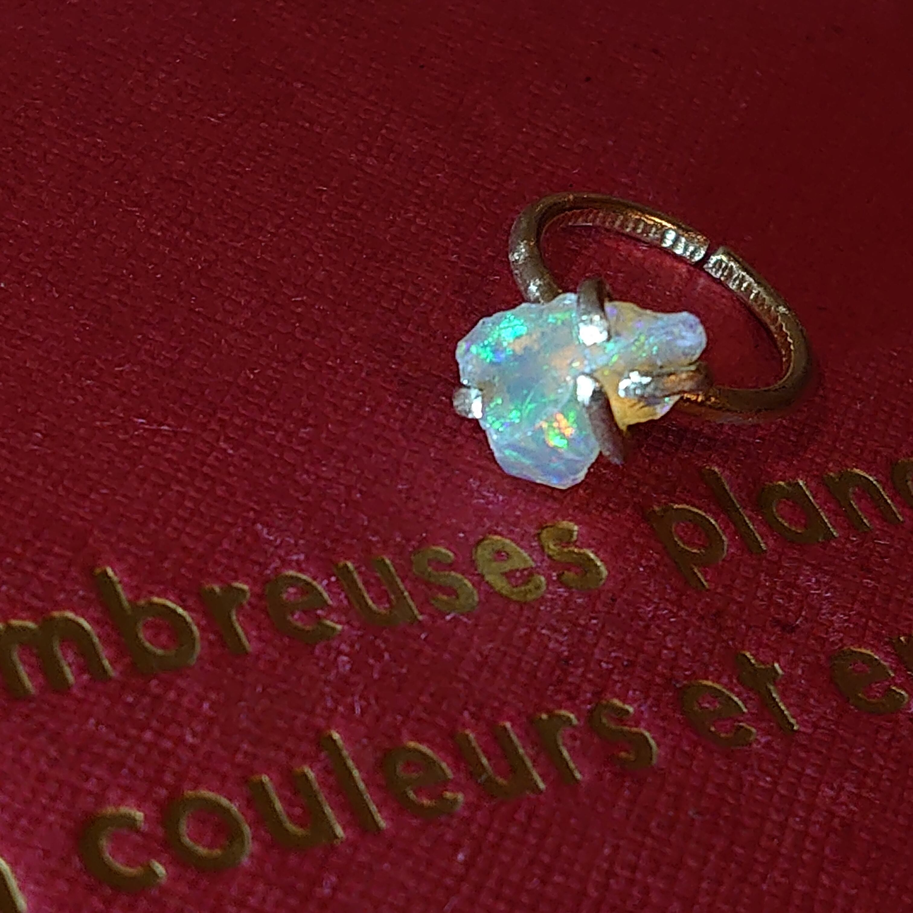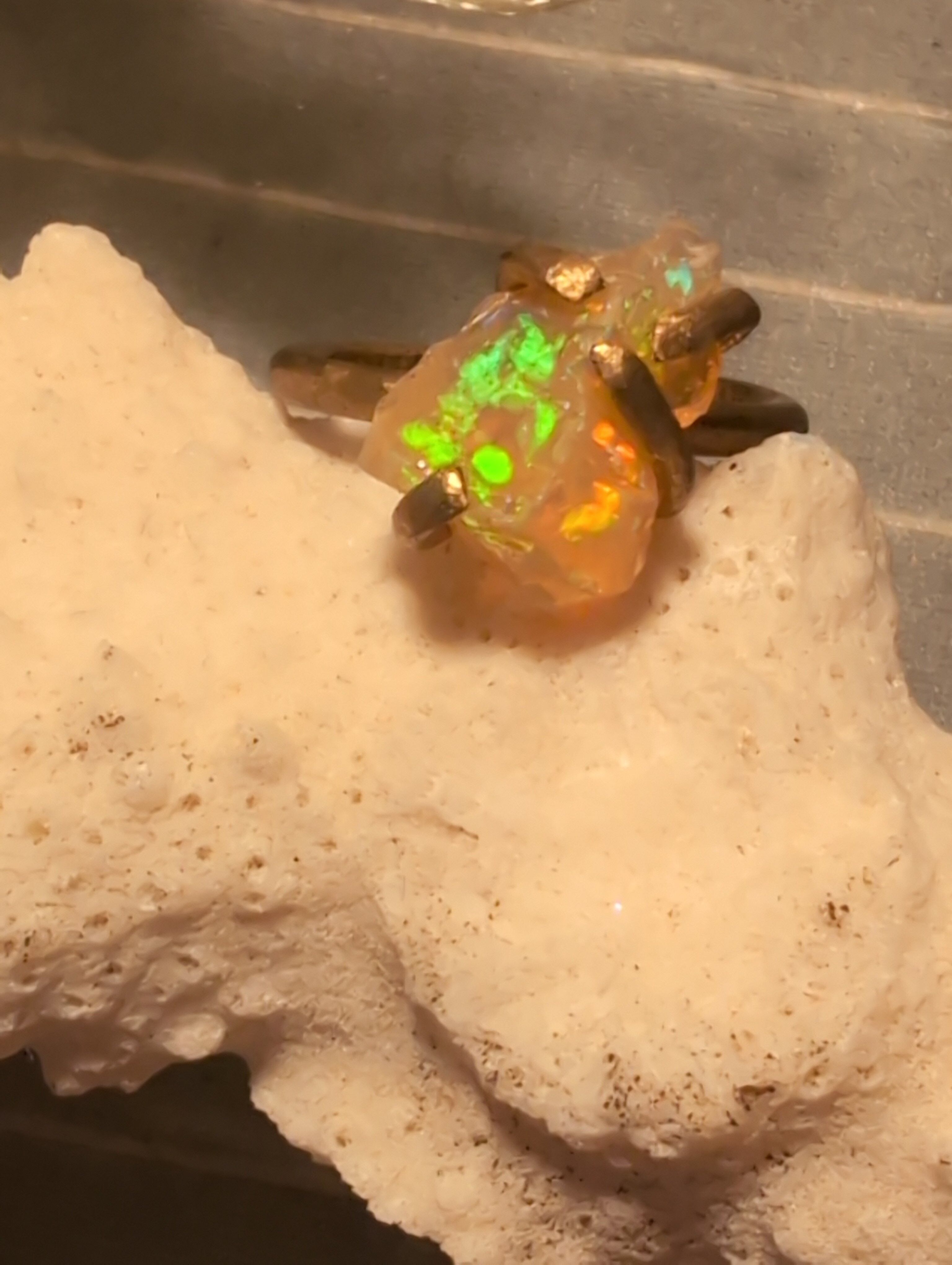 とても美しいオパレッサンスが出るオパール原石をブラスのリングに仕立てました。原石かち割りで色々な色を呈します。