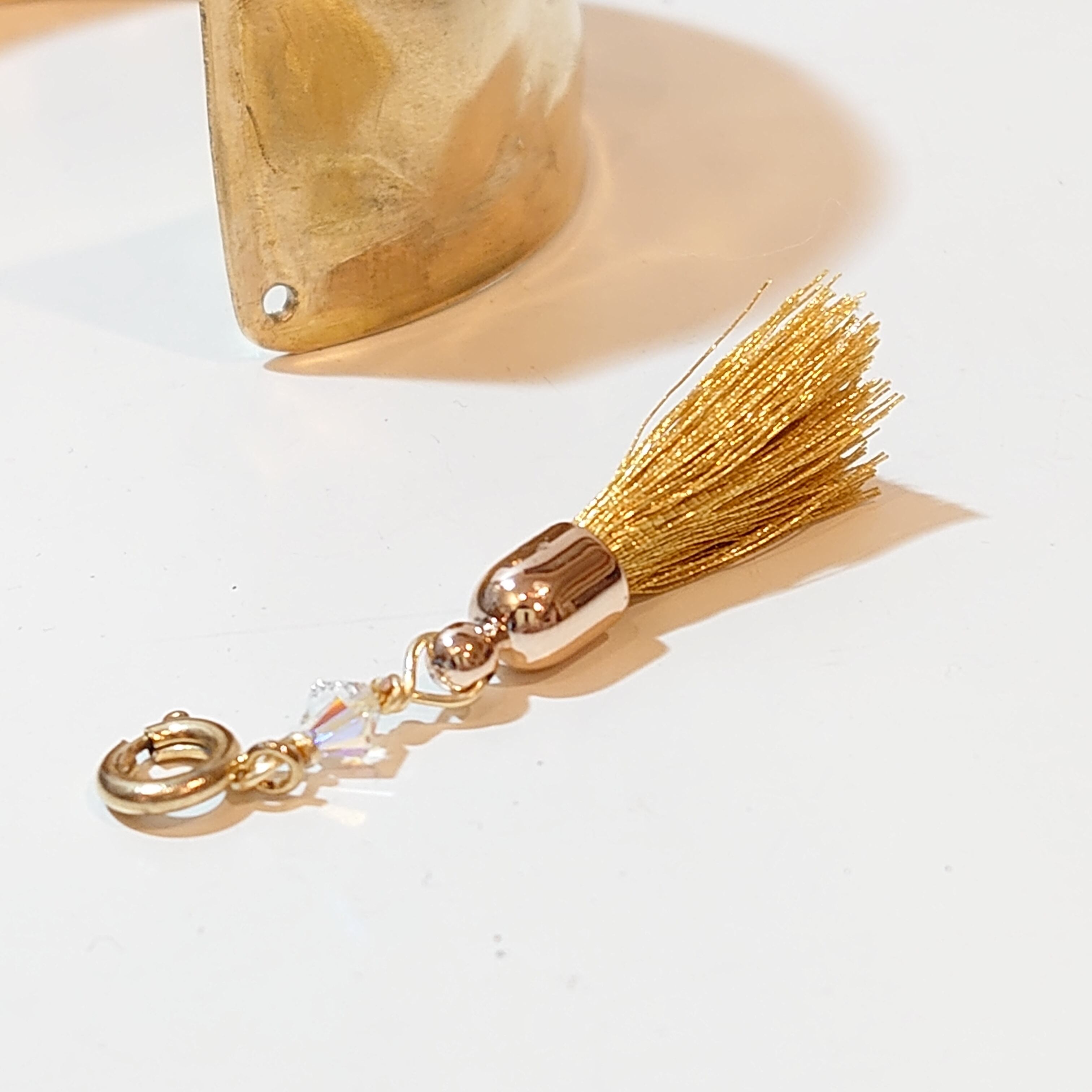真鍮の打ち出しの板状ブレスレットにタッセルをアレンジして、オリジナリティをだしてみました。