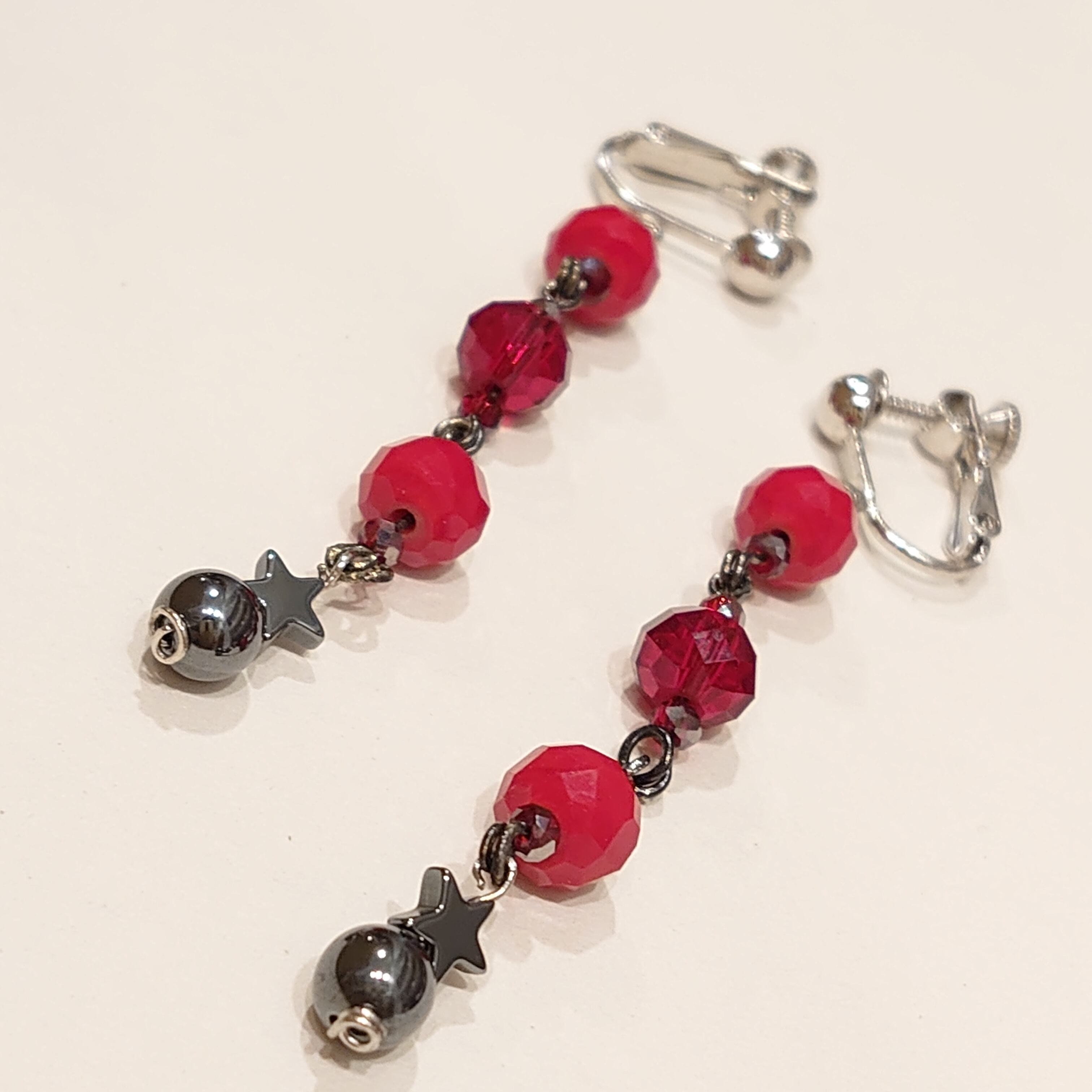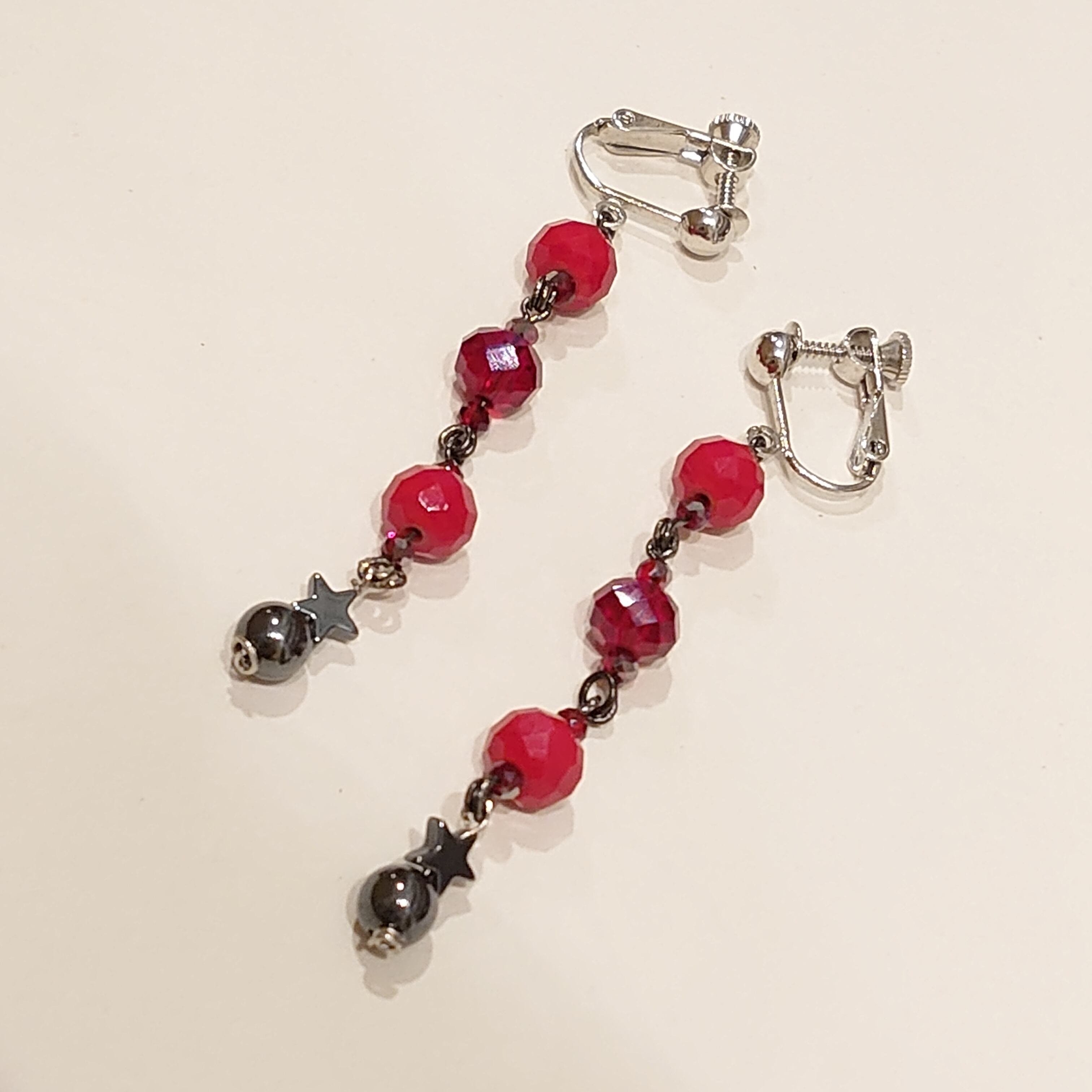 先端にキラキラする赤鉄鉱=ヘマタイトの星と丸だまがついているスイングイヤリング。
