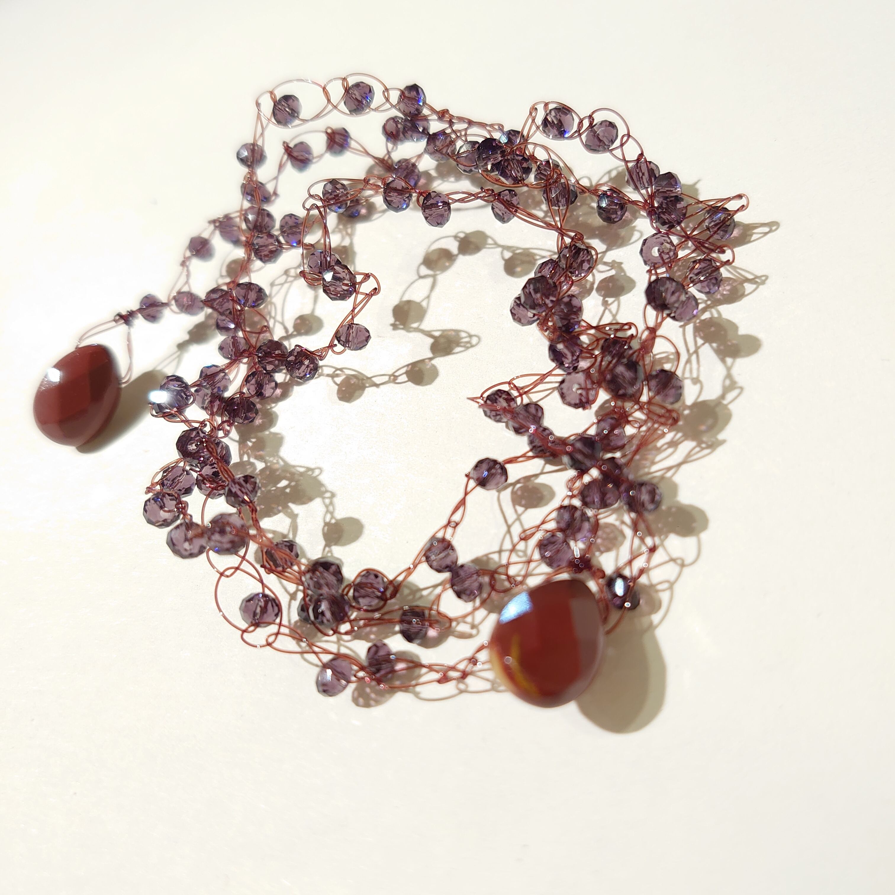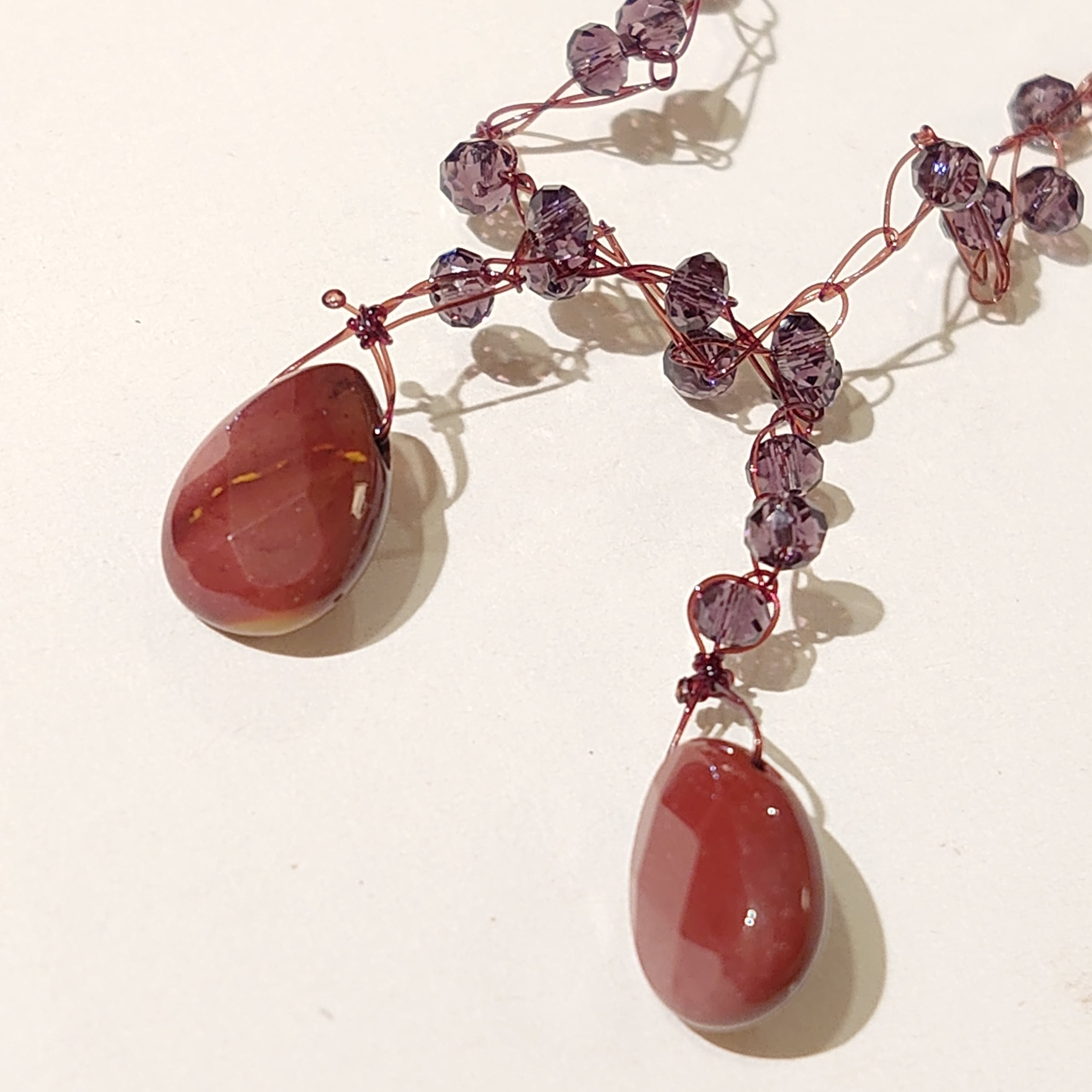ラリエットペンダント 天然石 レッドジャスバー ドロップ カット石 チェコビーズ ワイン色