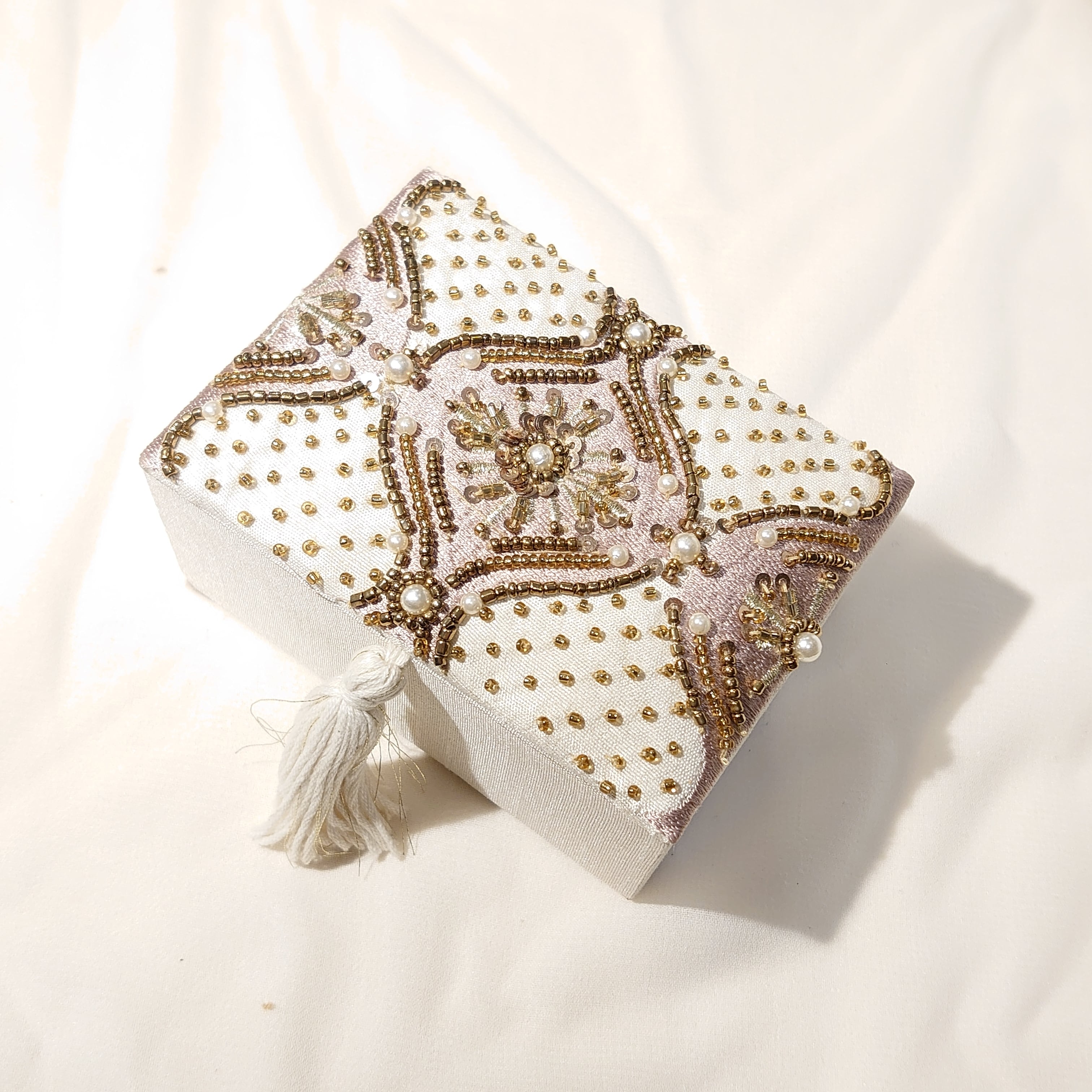 アクセサリー ボックス ケース ミラー付き パール ビーズ 刺繍 ピンク/グレー ボックス サテン布貼り タッセル アクセサリーなど 小物ケースに! ハンドメイド ビーズ手刺繍 インド製