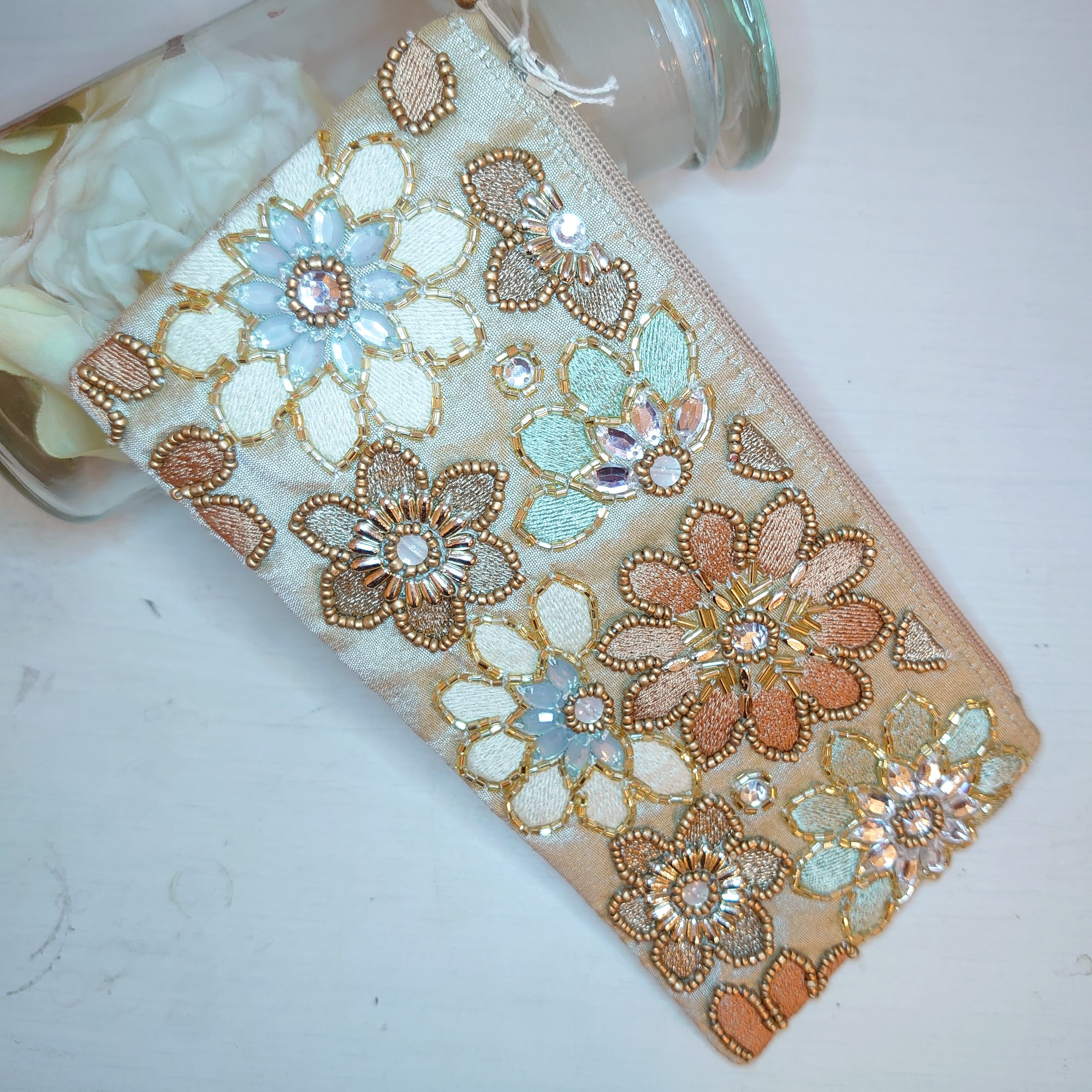 キラキラのビーズ手刺繍がゴージャスな横長ポーチです。刺繍は表だけです。