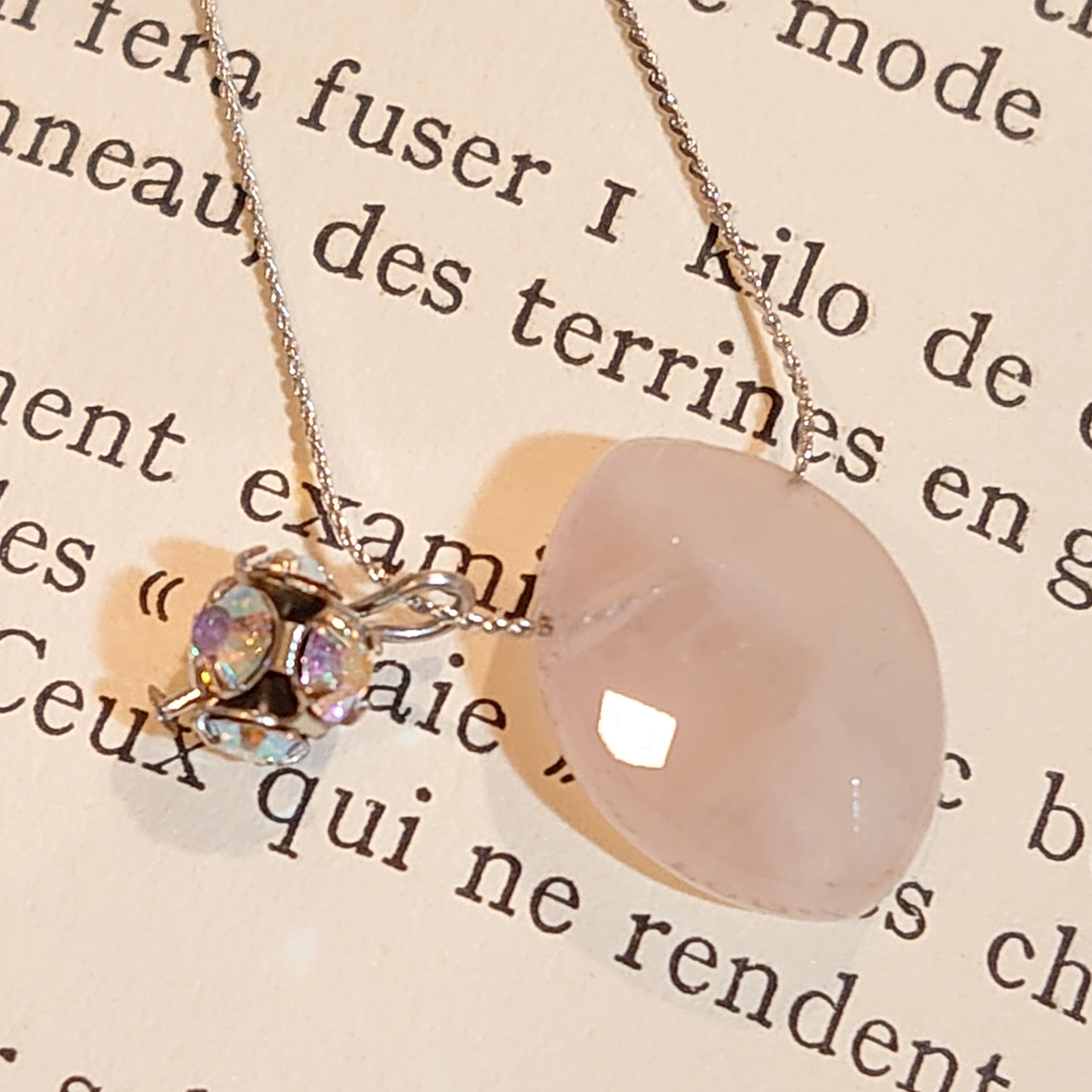 ピンクカルセドニー、デザインメッキチェーン、スワロフスキーのボール