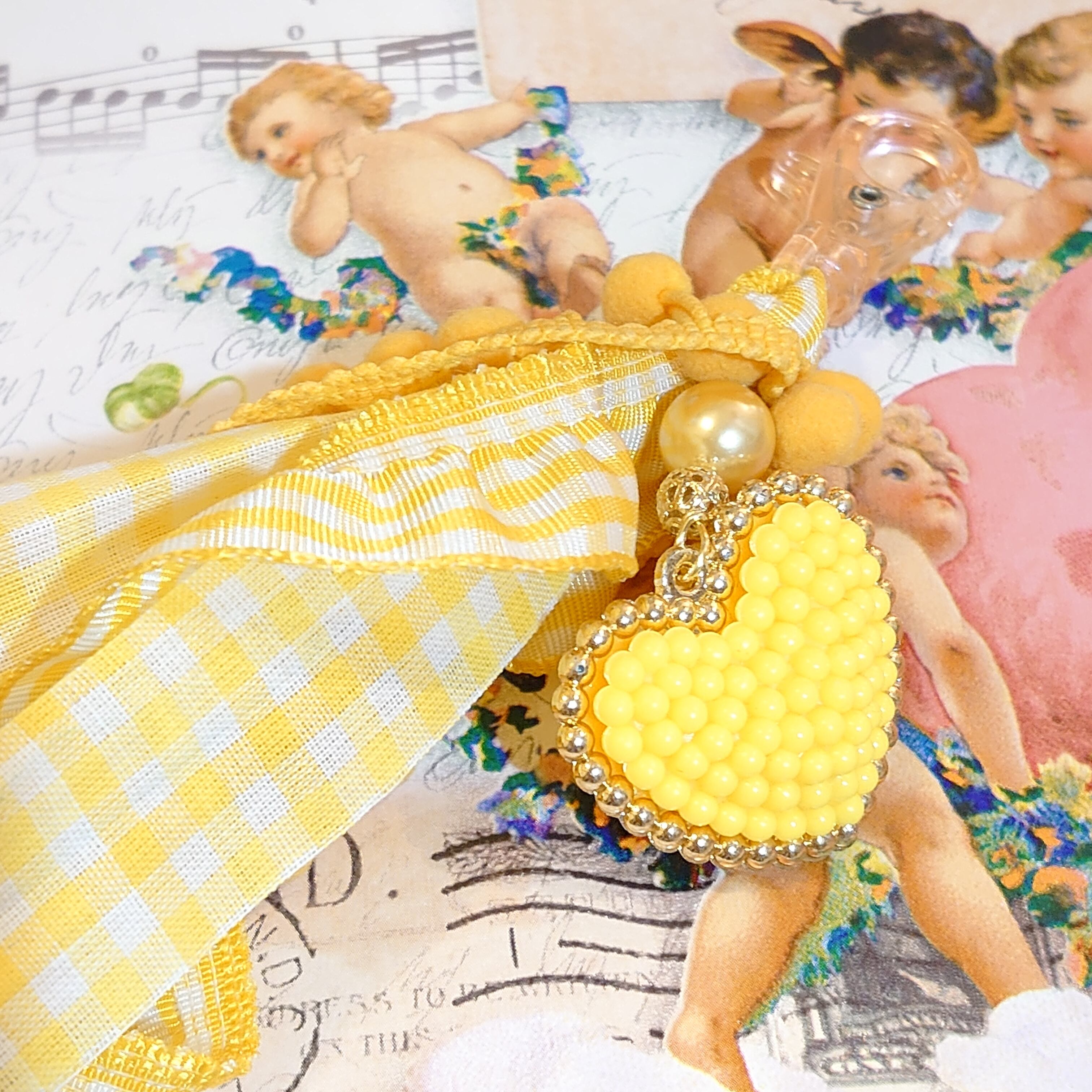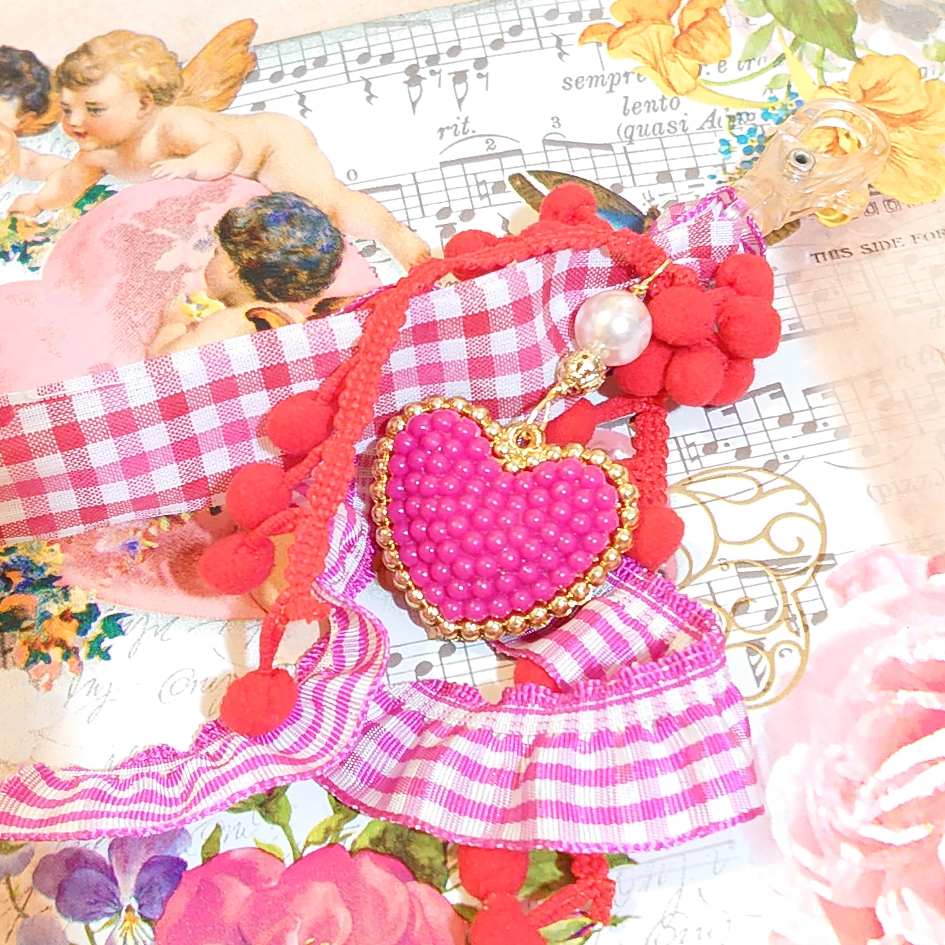 カラフルなリボンやポンポンを組み合わせたハンドメイドテイストが魅力的な1点物のチャームです。