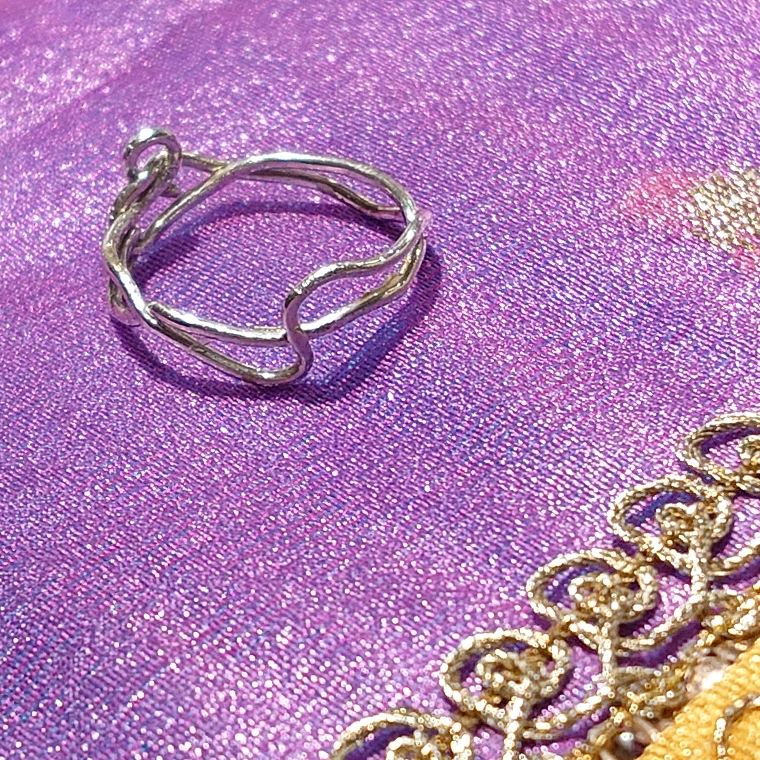 デザイナー(てんちょう✌️)が、若き頃に熱中したボディーボードの体験を思い起こし、波のふちに見える小さな波しぶきをイメージしながら曲げ、形を作りました。波に揺られ、波に乗れる前に見上げて見える息を呑むような美しい波のふちに現れる小さな泡やしぶき、その瞬間にこそ感じる海の魅力を込めたリングは、エレガントでありながらユニークなアクセサリーになっています。
