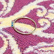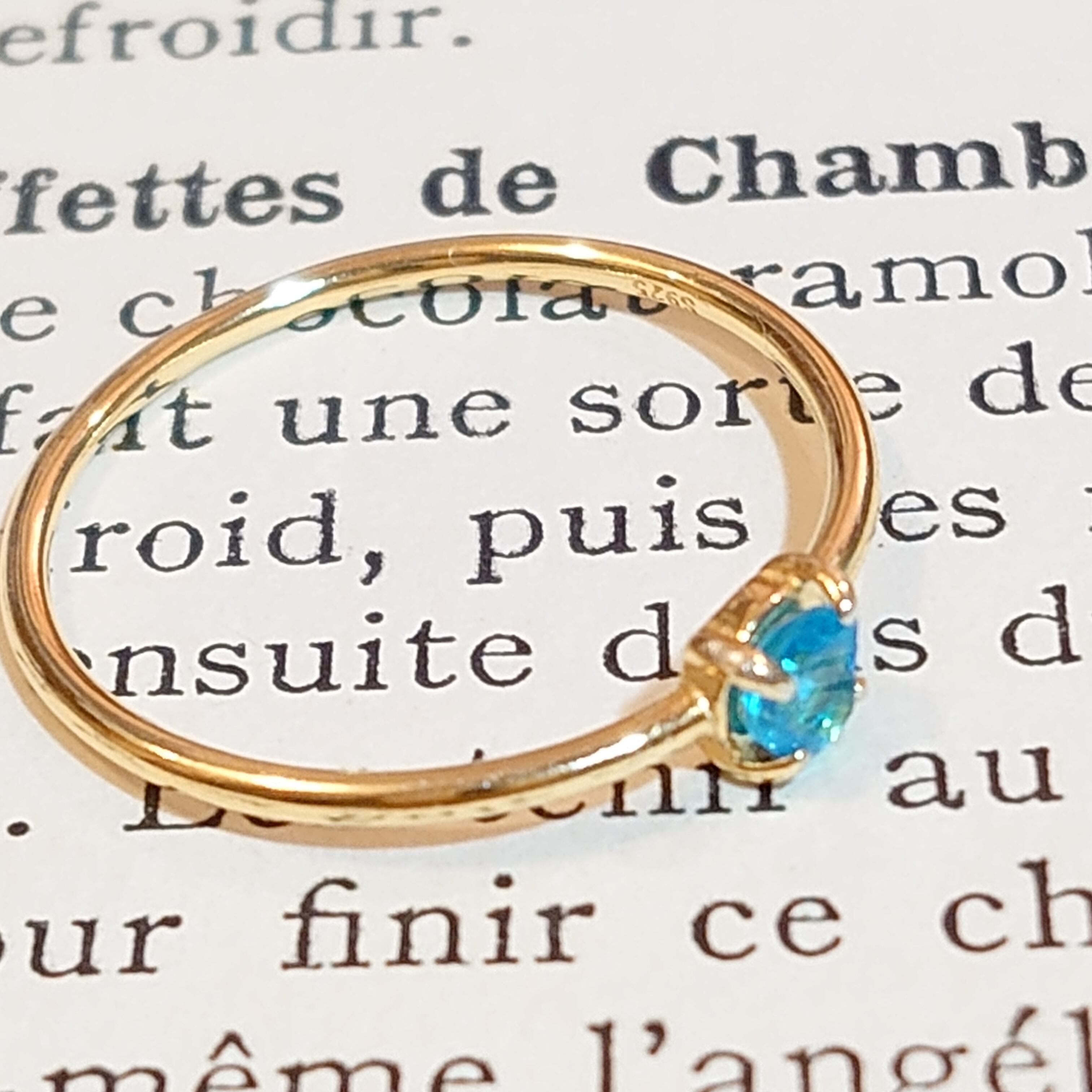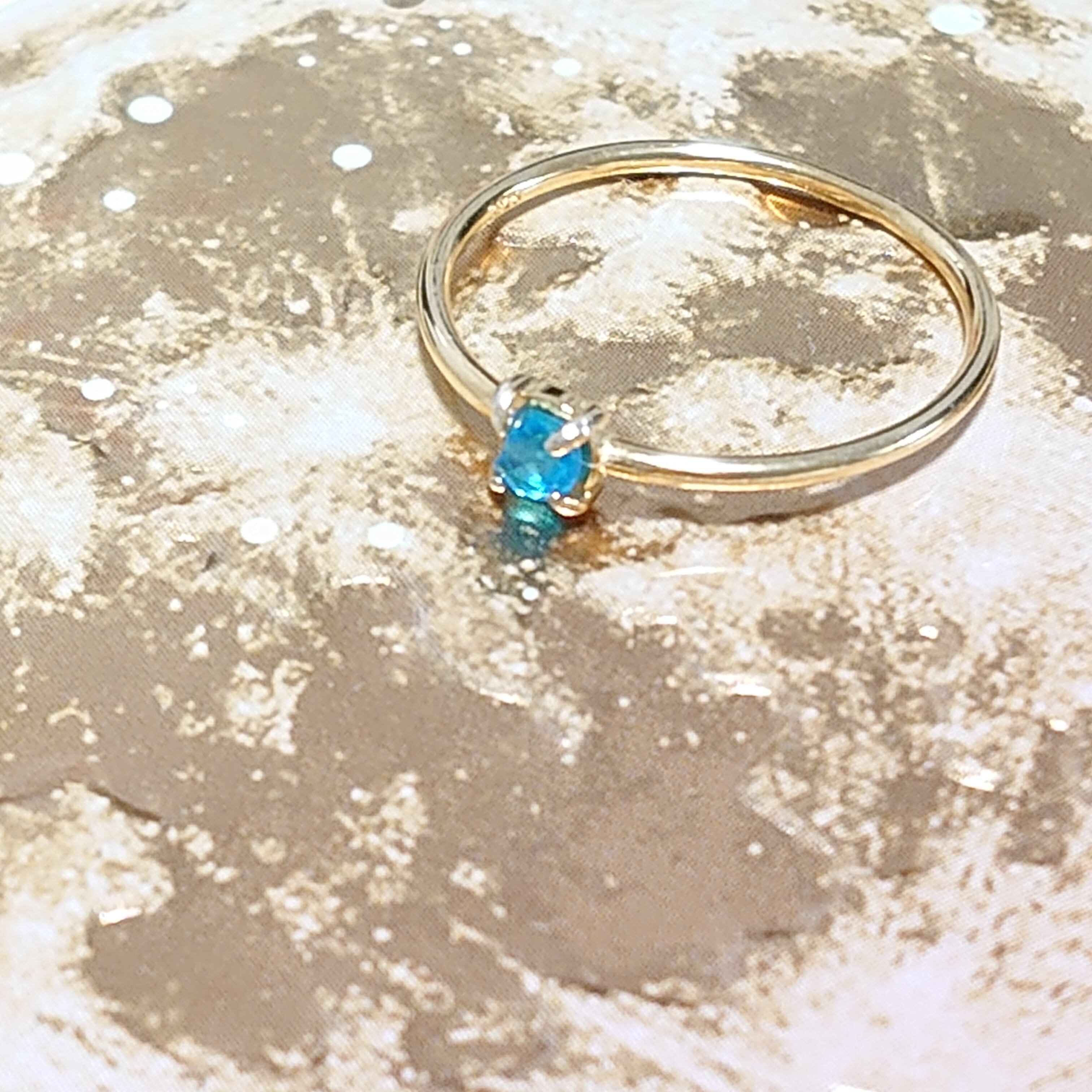 ブルーのネオンカラーが美しく輝くアパタイトを使用し、シルバー925に18金コーティングを施したリングに嵌め込みました。