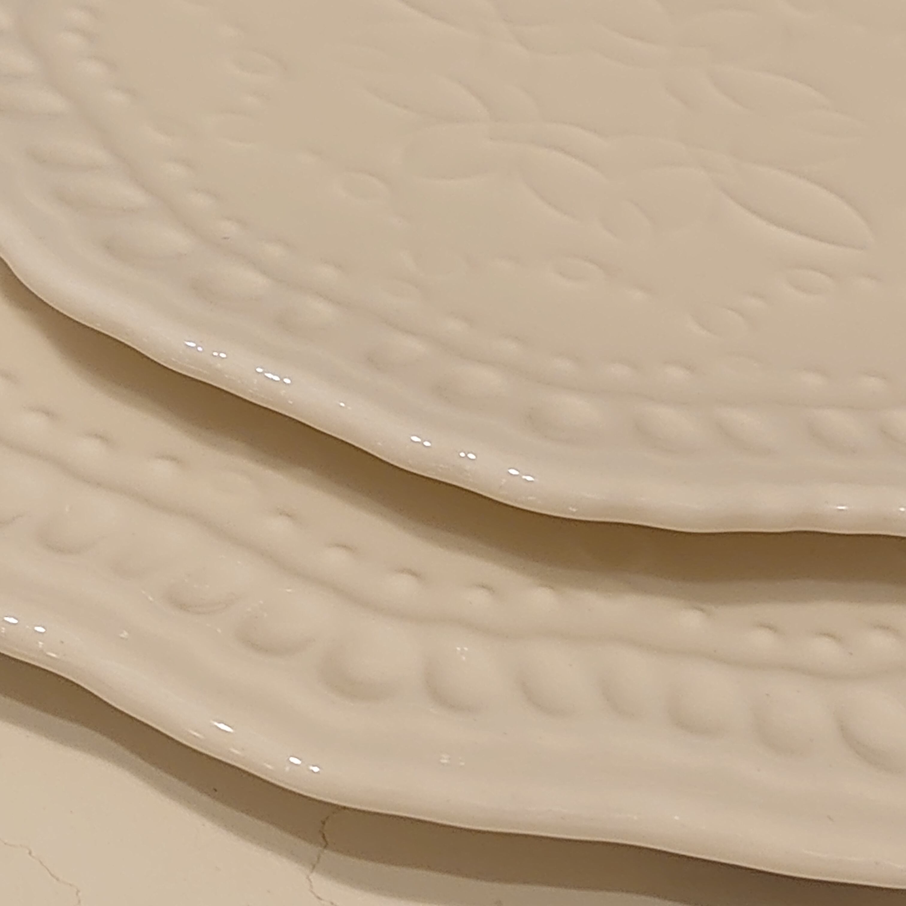 白色でエレガントな雰囲気を持つ120サイズの平らなお皿は、レリーフが施され美しいデザインです。