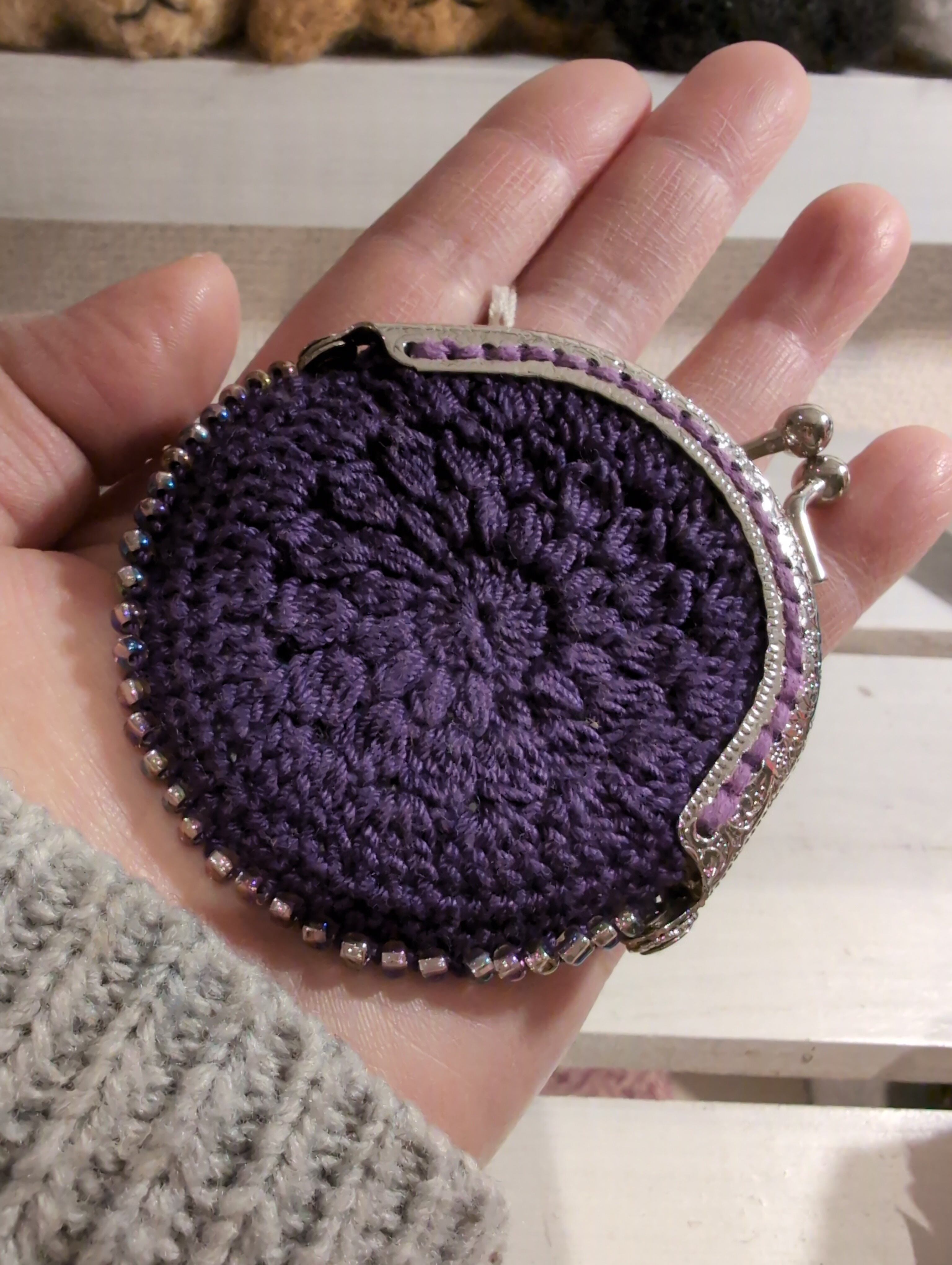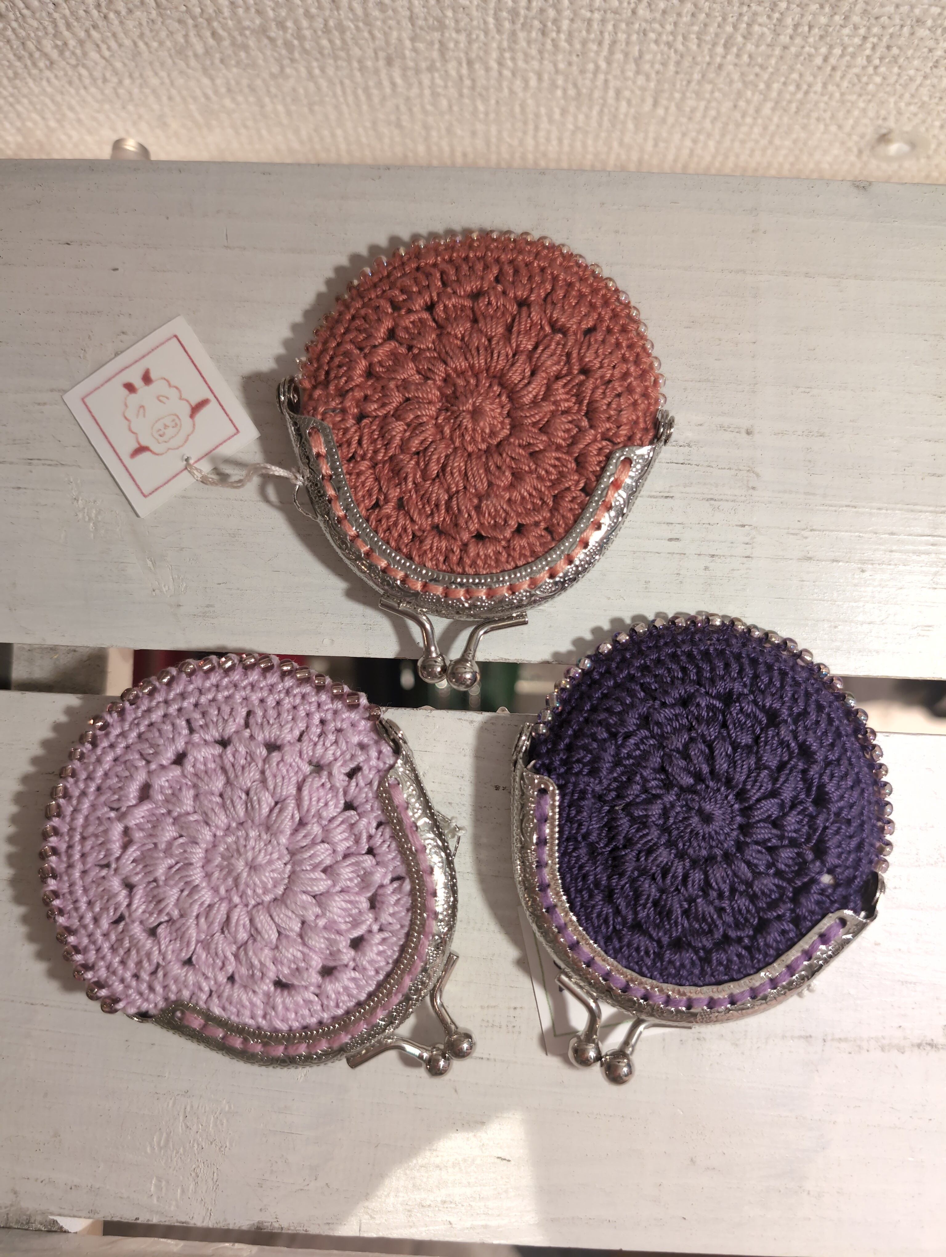 がま口 手編みモチーフ編み小 とってもかわいい!内布小花柄など